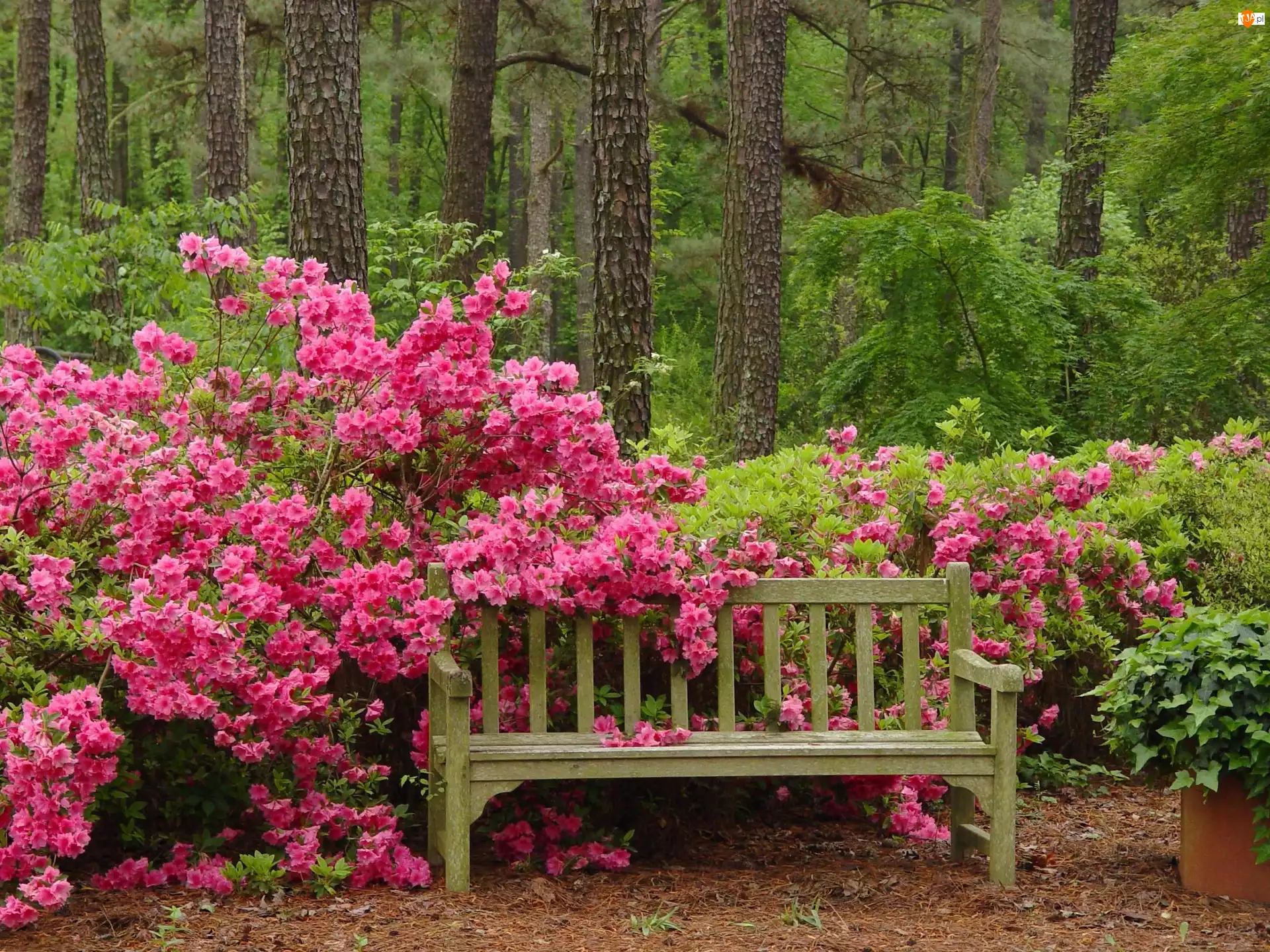 Krzewy, Kwitnące, Las, Rododendrony, Kwitnące, Ławeczka