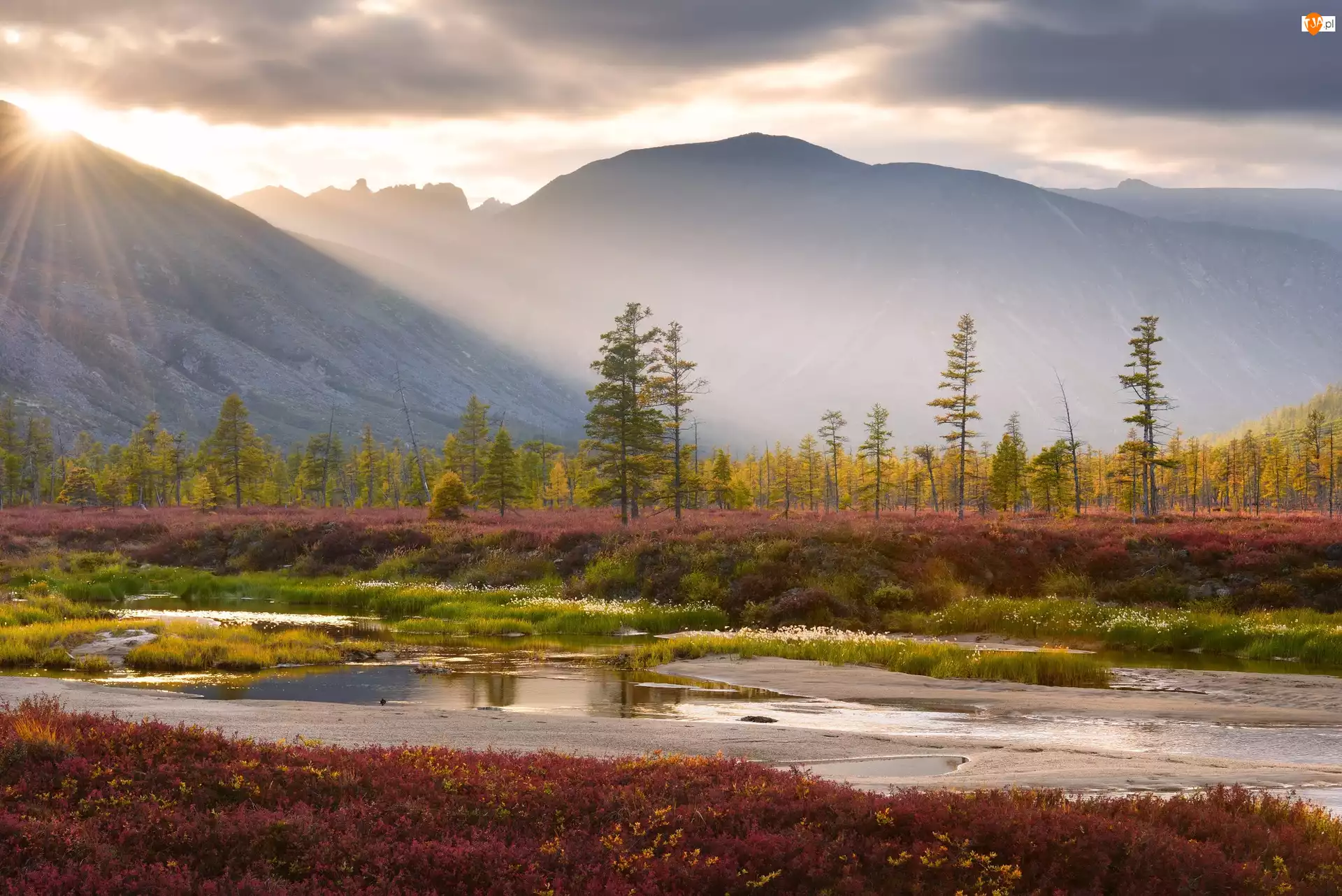 Rosja, Brzeg, Obwód magadański, Promienie słońca, Kołyma, Jezioro Jack London, Drzewa, Góry Kołymskie, Krzewy