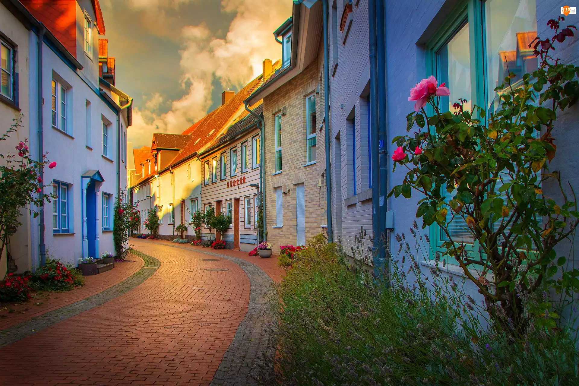 Krzewy róż obok domów przy brukowanej uliczce