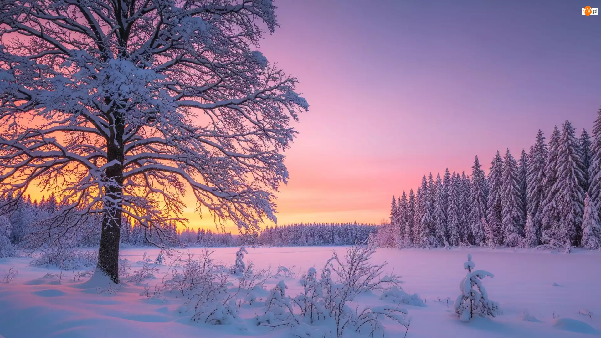 Krzewy, Zachód słońca, Drzewa, Zima, Ośnieżon