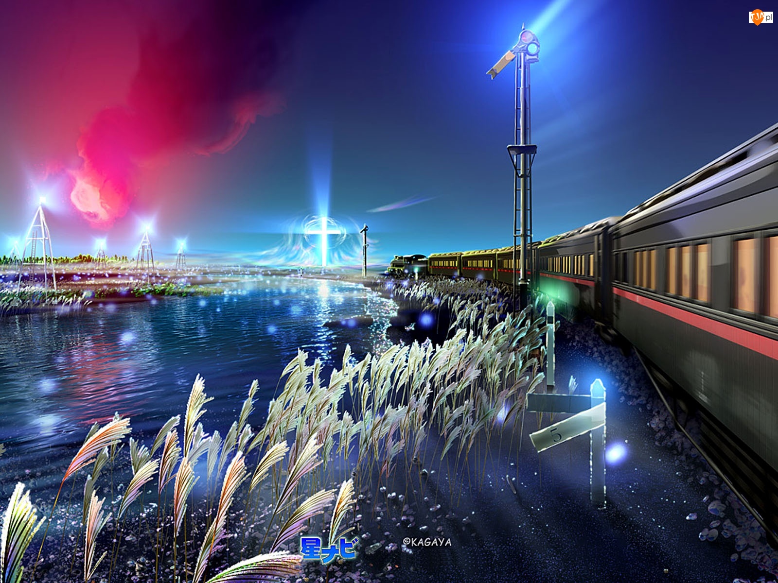 Pociąg, Krzyż, Kagaya, Grafika, Woda