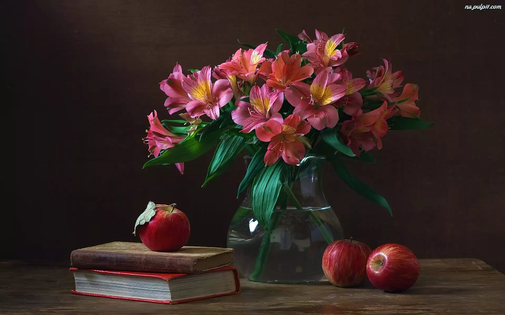 Książki, Bukiet, Kwiatów, Różowych, Jabłka