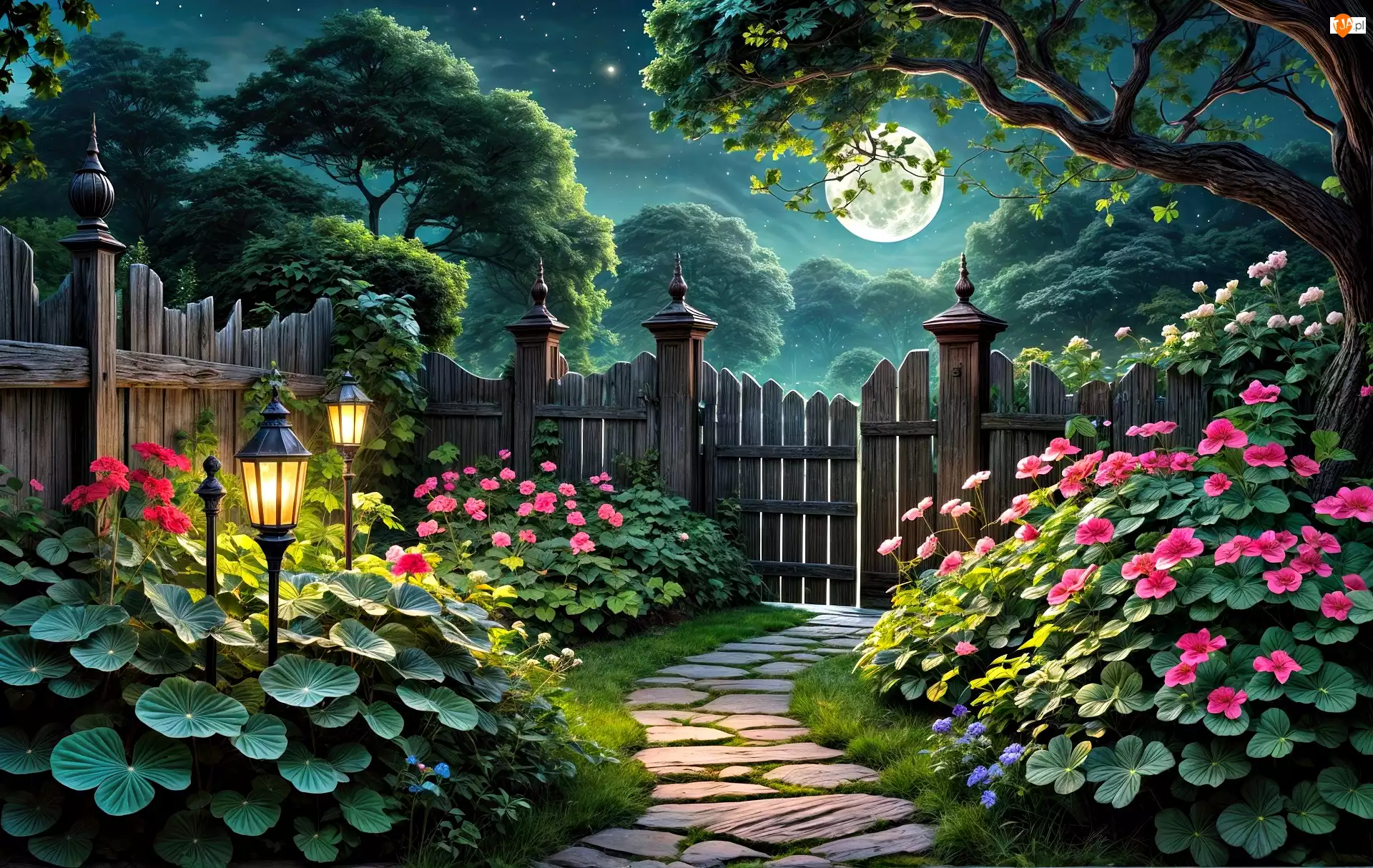 Księżyc, Ogród, Płot, Noc, Kwiaty, Drzewa, Grafika, Lampy