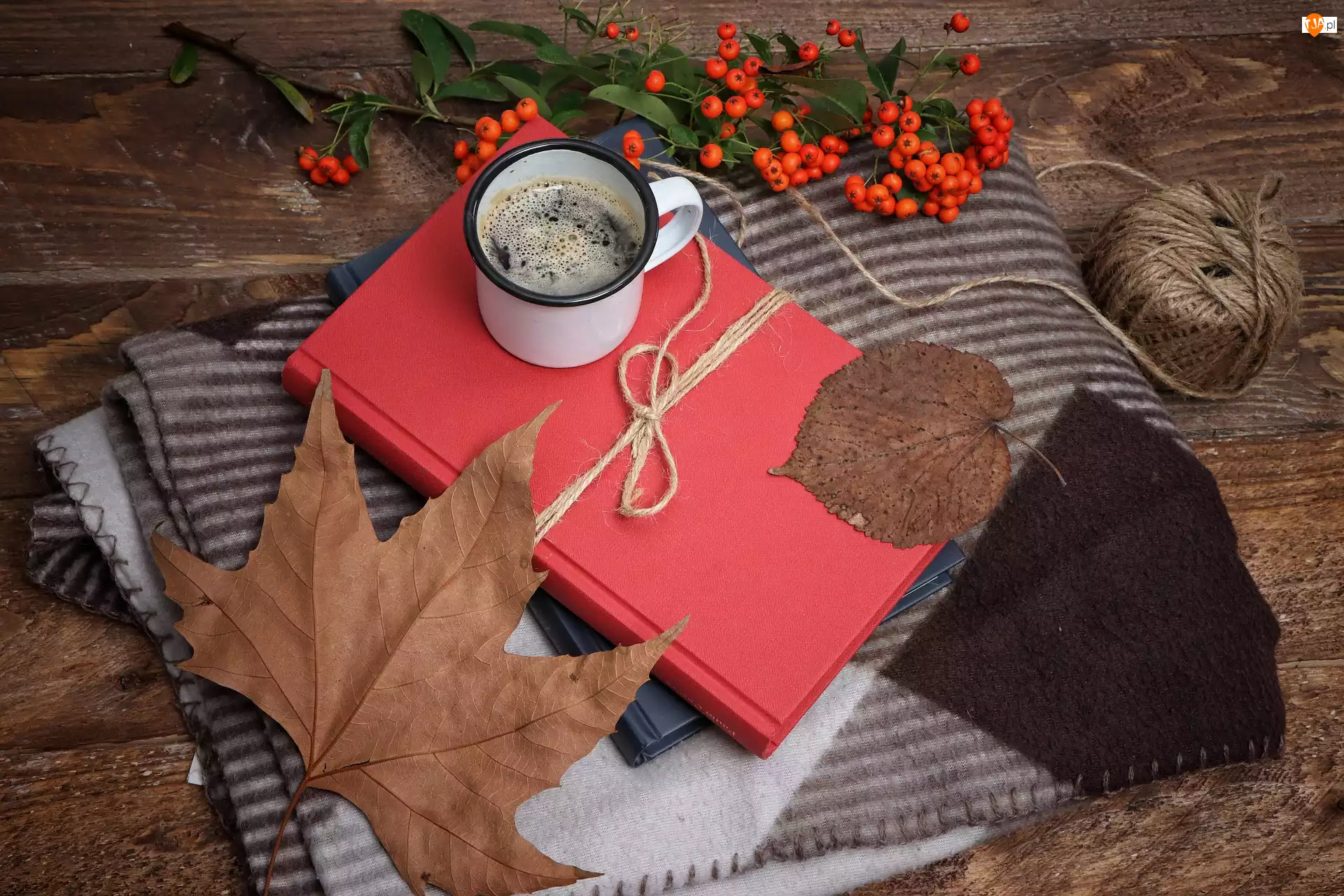 Jarzębina, Kompozycja, Kawa, Koc, Książka, Liście