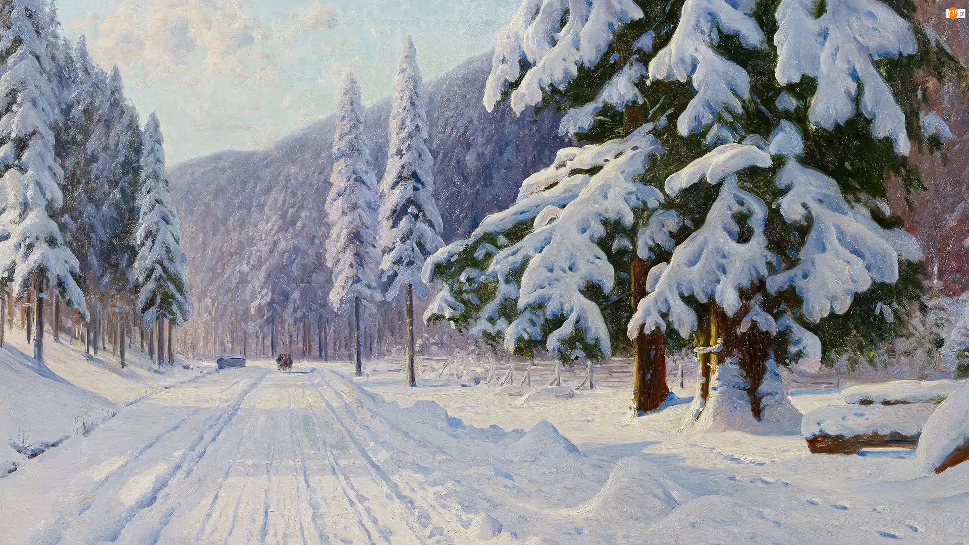 Droga, Malarstwo, Zima, Drzewa, Obraz, Las, Kulig, Walter Moras