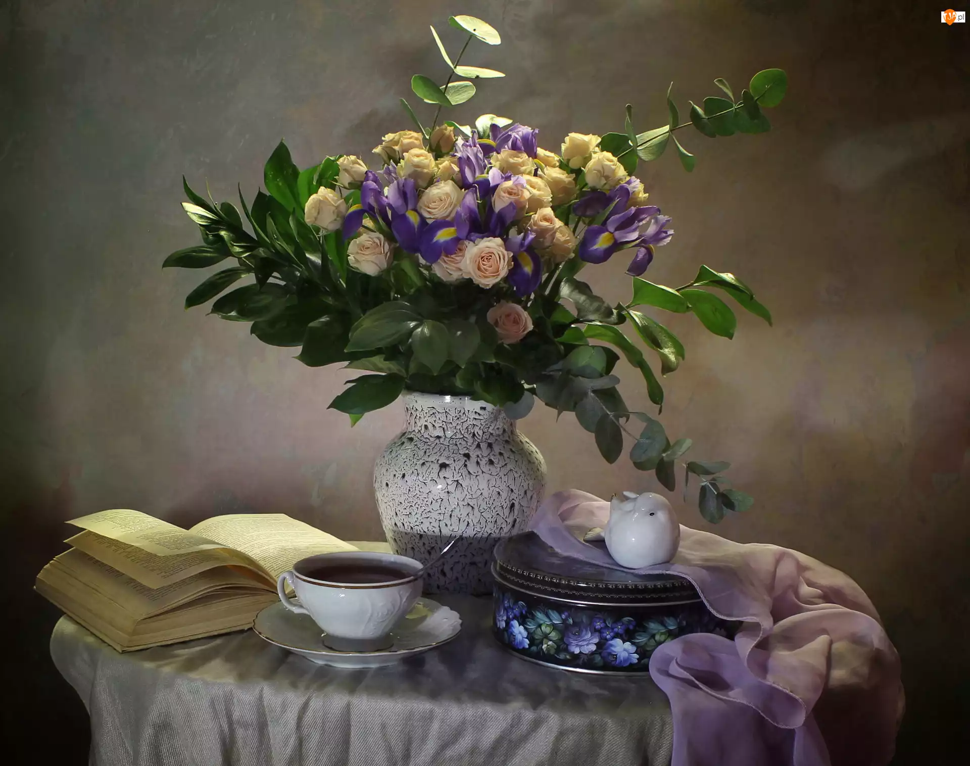 Irysy, Wazon, Herbata, Książka, Bukiet, Puszka, Gałązki, Kwiaty, Filiżanka, Róże, Kompozycja