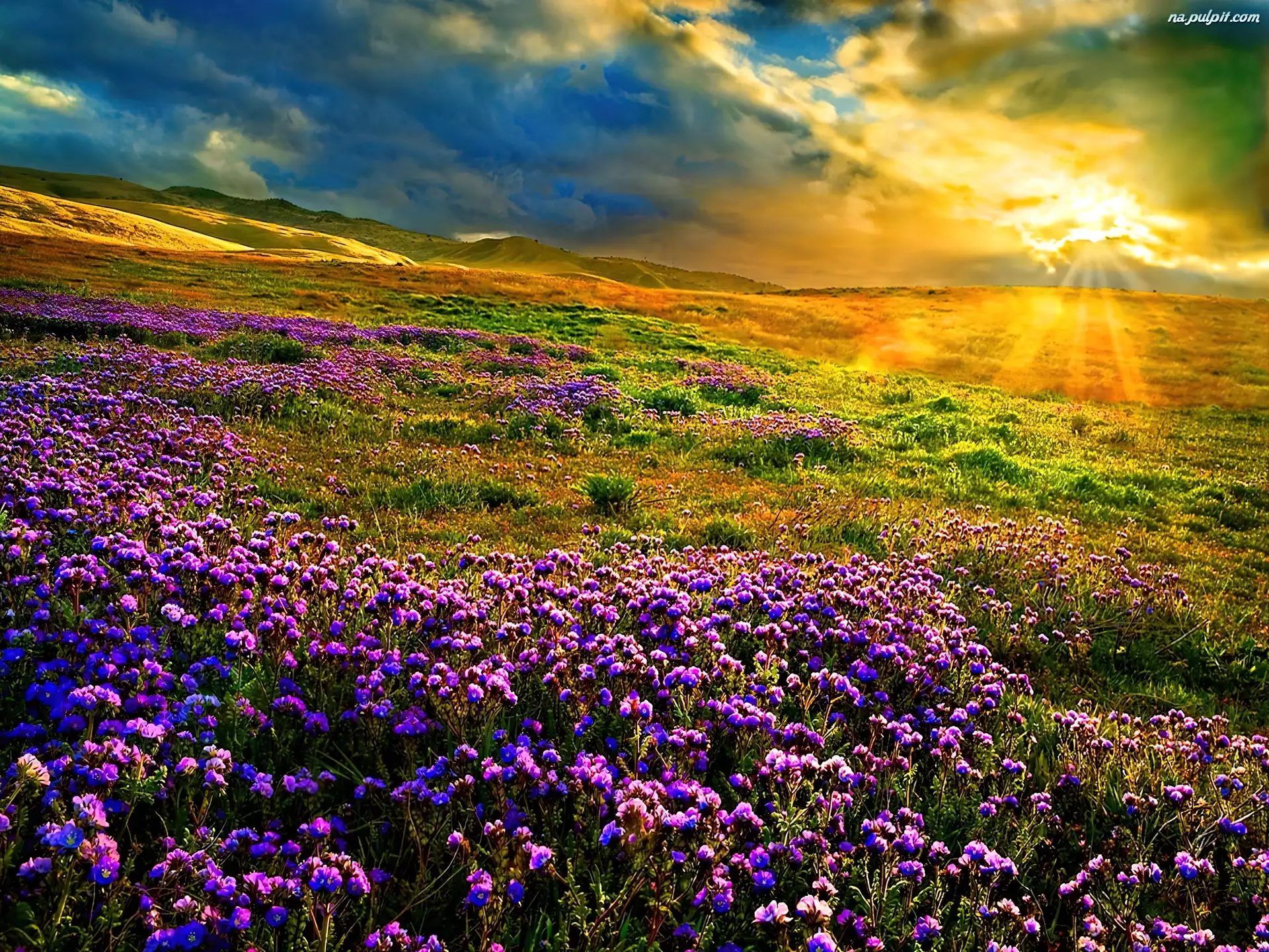 Kwiatuszki, Zachód, Łąka, Słońca, Fioletowe