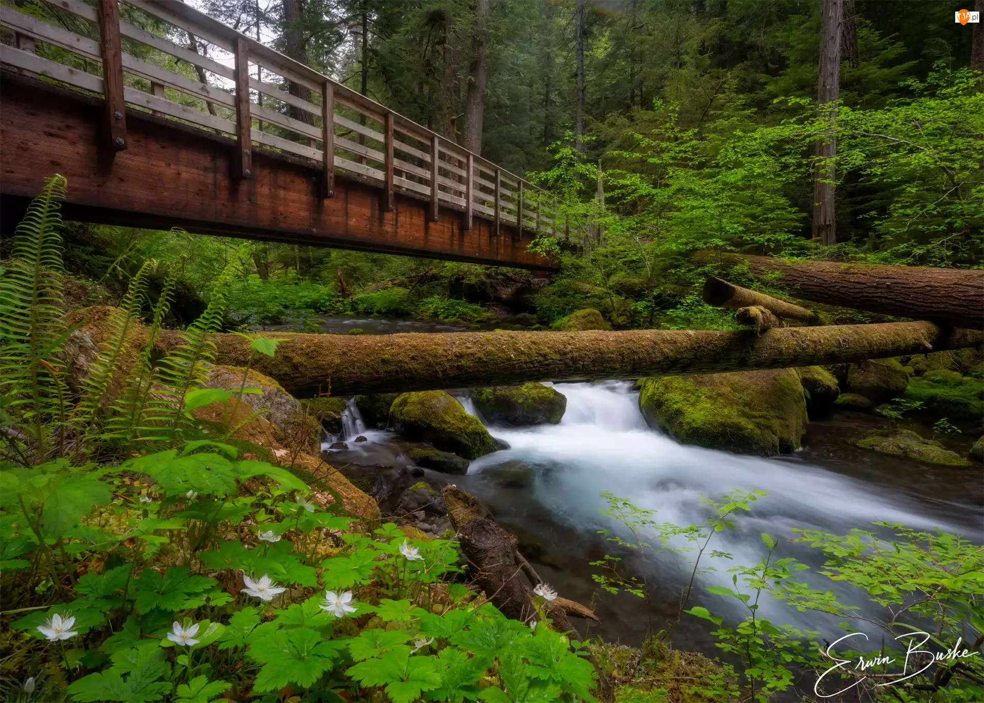 Kwiaty, Big Quilcene, Paprocie, Stany Zjednoczone, Drzewa, Rzeka, Powalone, Kamienie, Most, Drzewa, Omszałe, Stan Waszyngton
