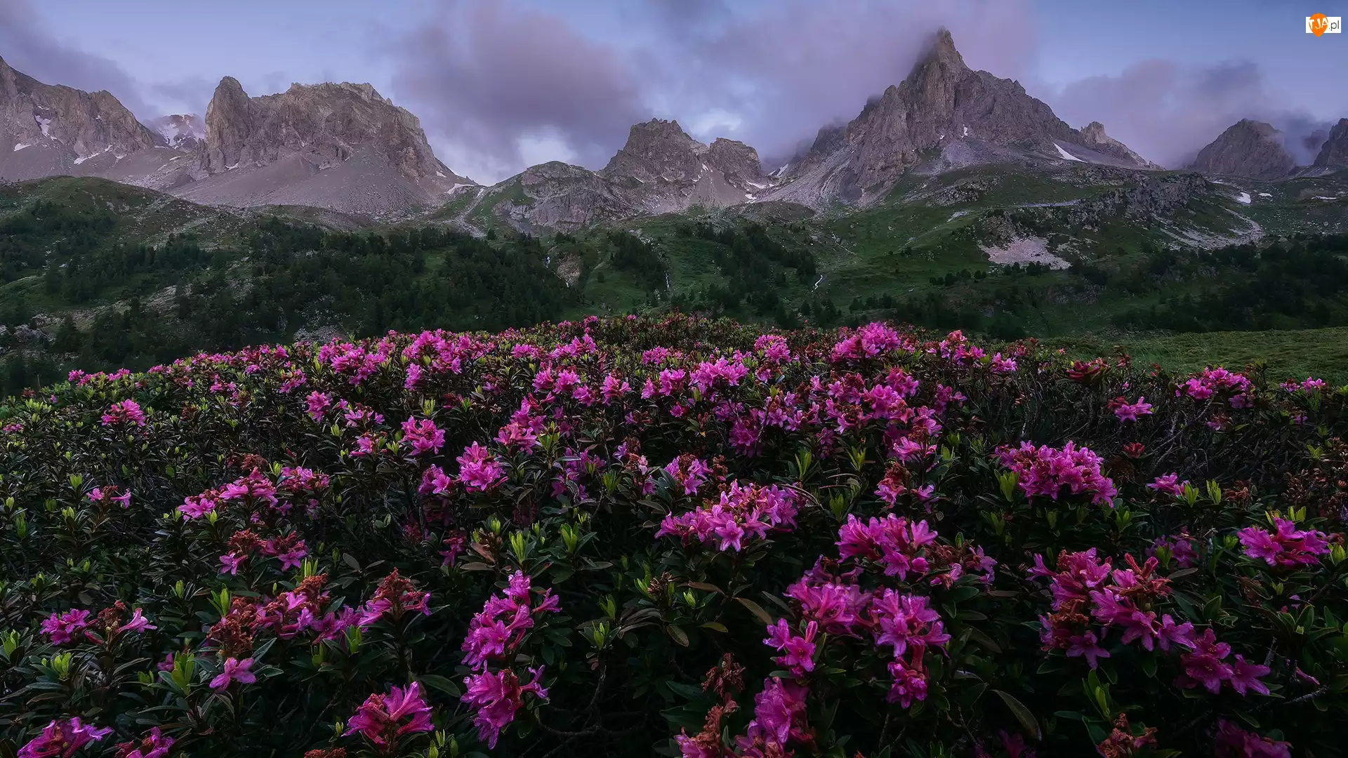Kwiaty, Chmury, Drzewa, Góry, Różaneczniki