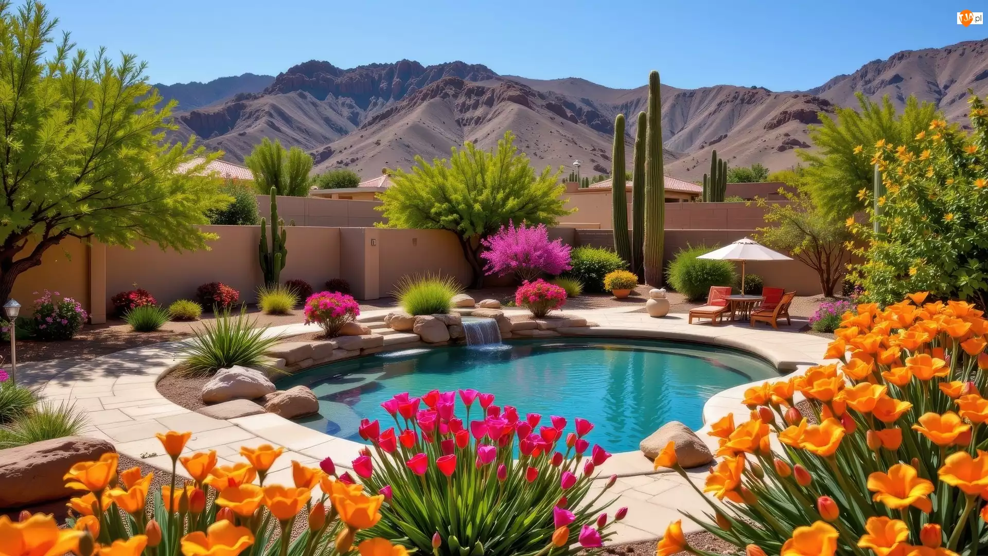 Kwiaty, Drzewa, Kolorowe, Basen, Góry