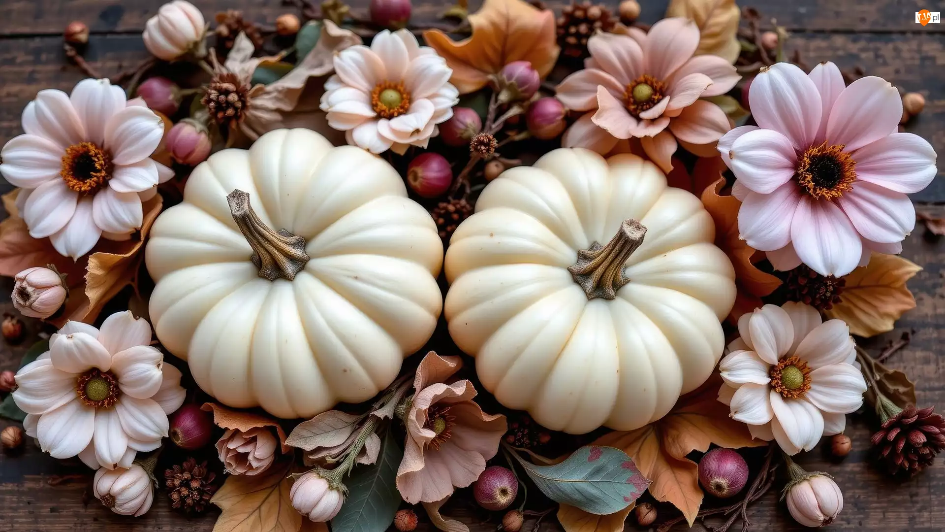 Kwiaty, Dwie, Różowe, Brązowe, Białe, Białe, Listki, Dynie