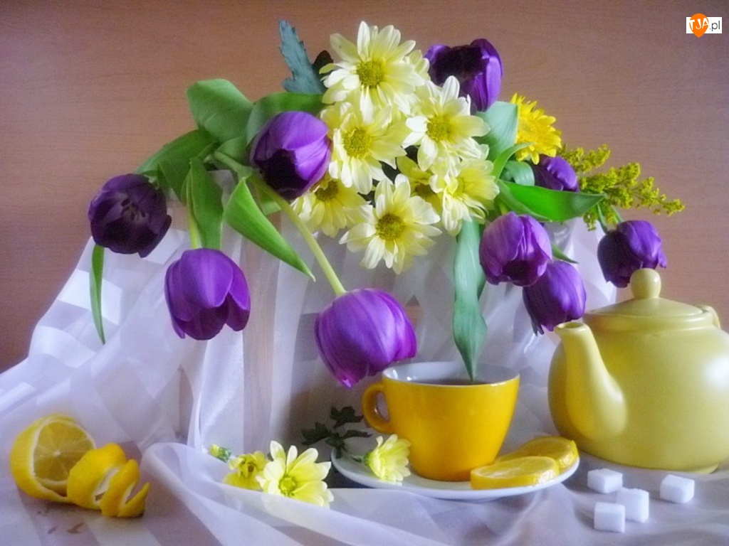 Dzbanek, Kwiaty, Fioletowe, Tulipany