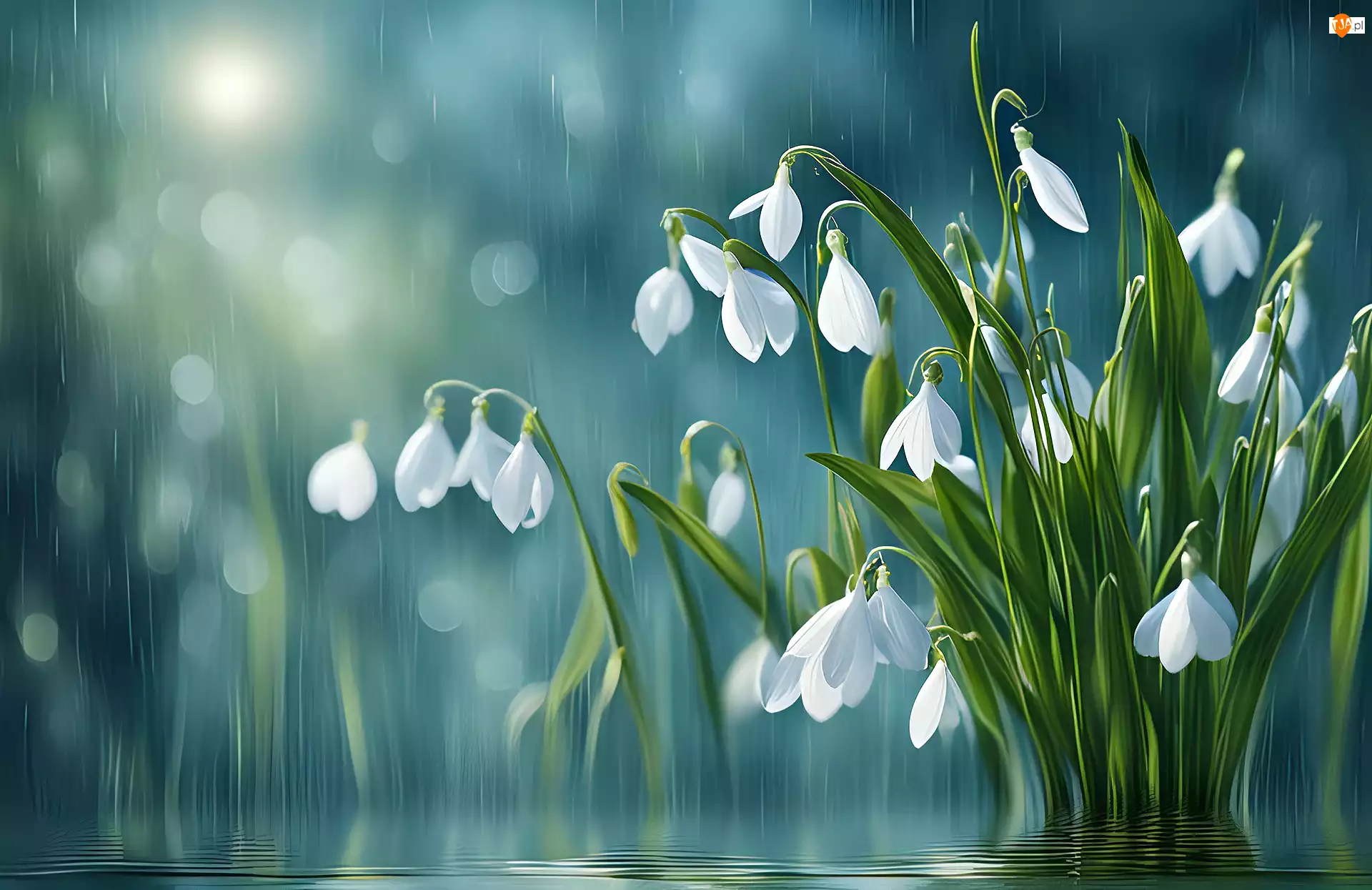 Kwiaty, Grafika, Białe, Przebiśniegi, Deszcz