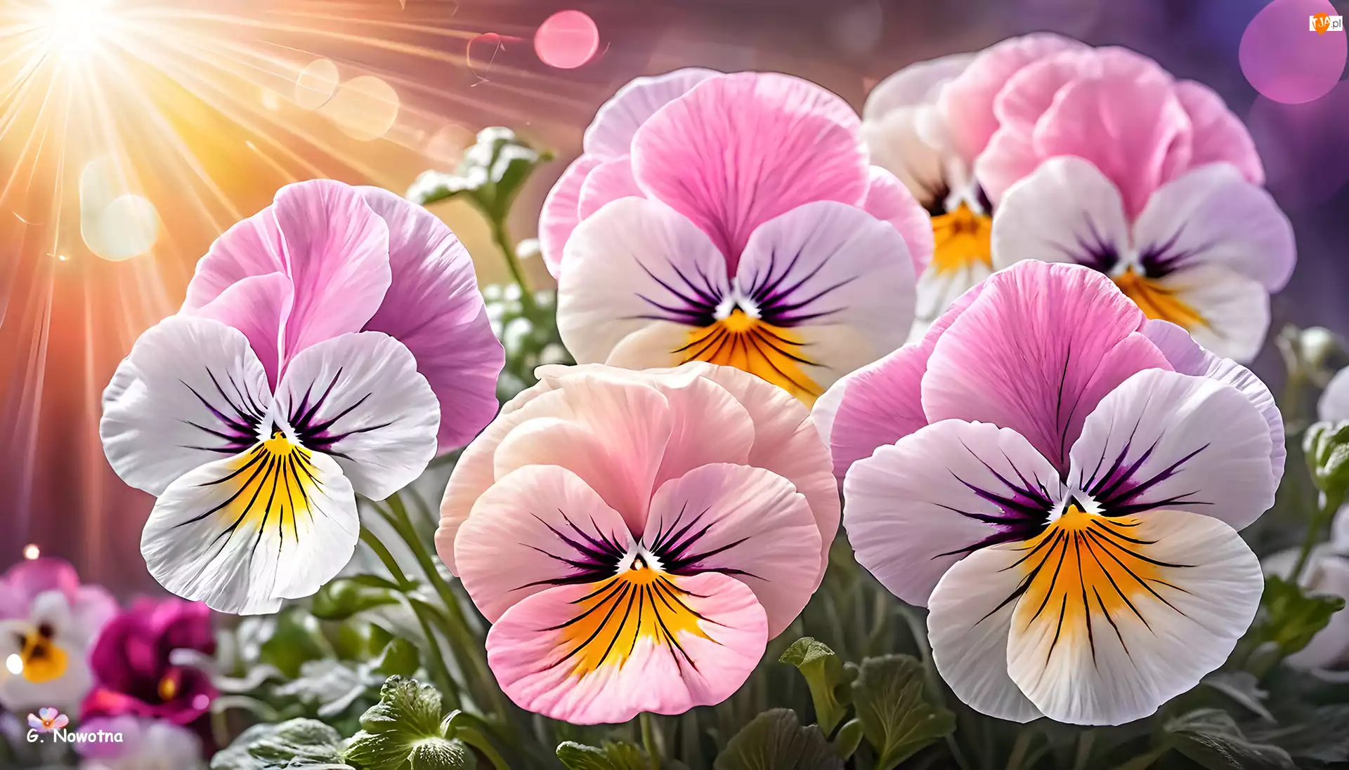 Kwiaty, Grafika, Bratki, Kolorowe, Promienie słońca