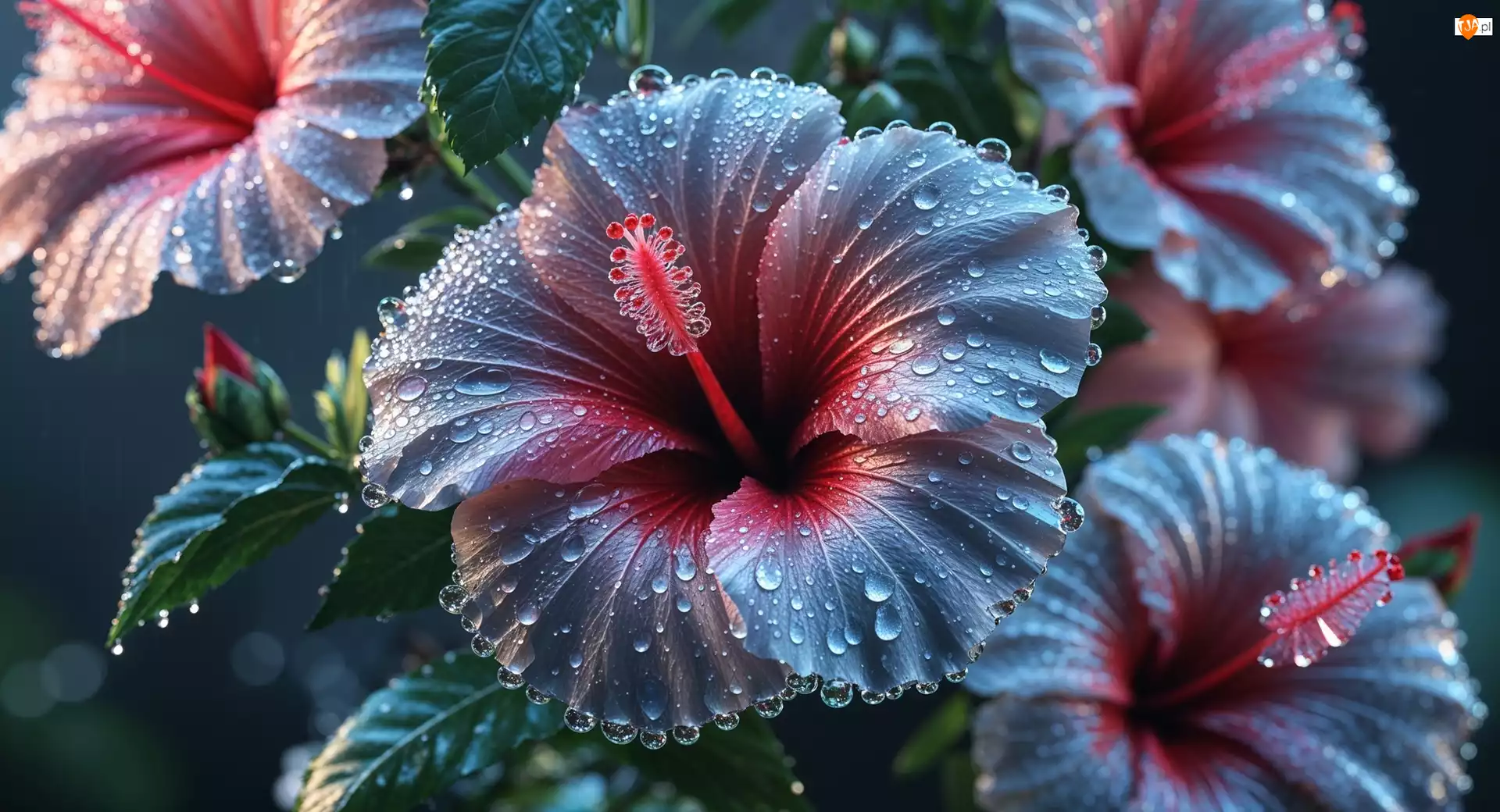 Kwiaty, Grafika, Hibiskusy, Mokre, Krople