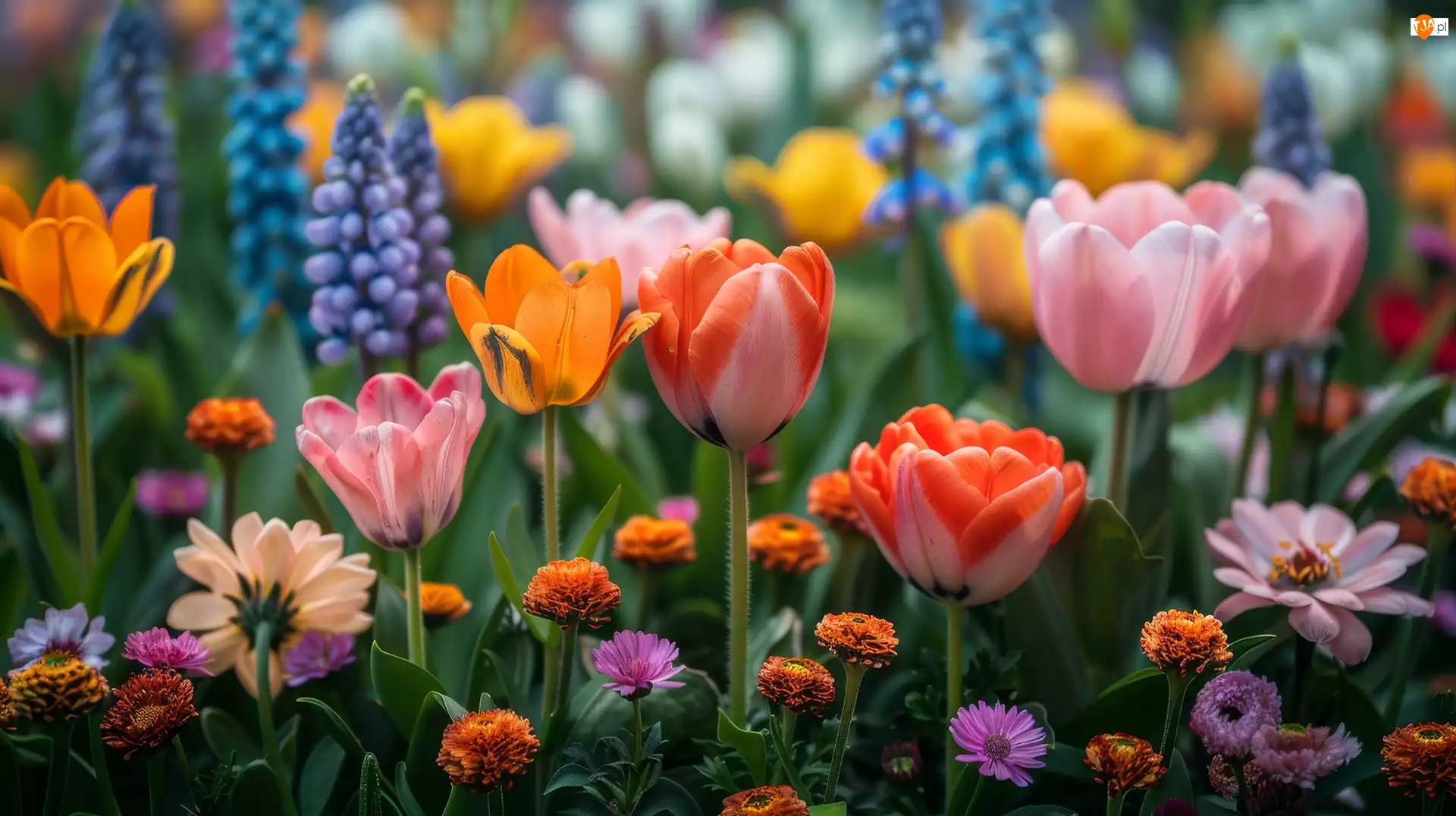 Kwiaty, Grafika, Kolorowe, Tulipany, Łąka