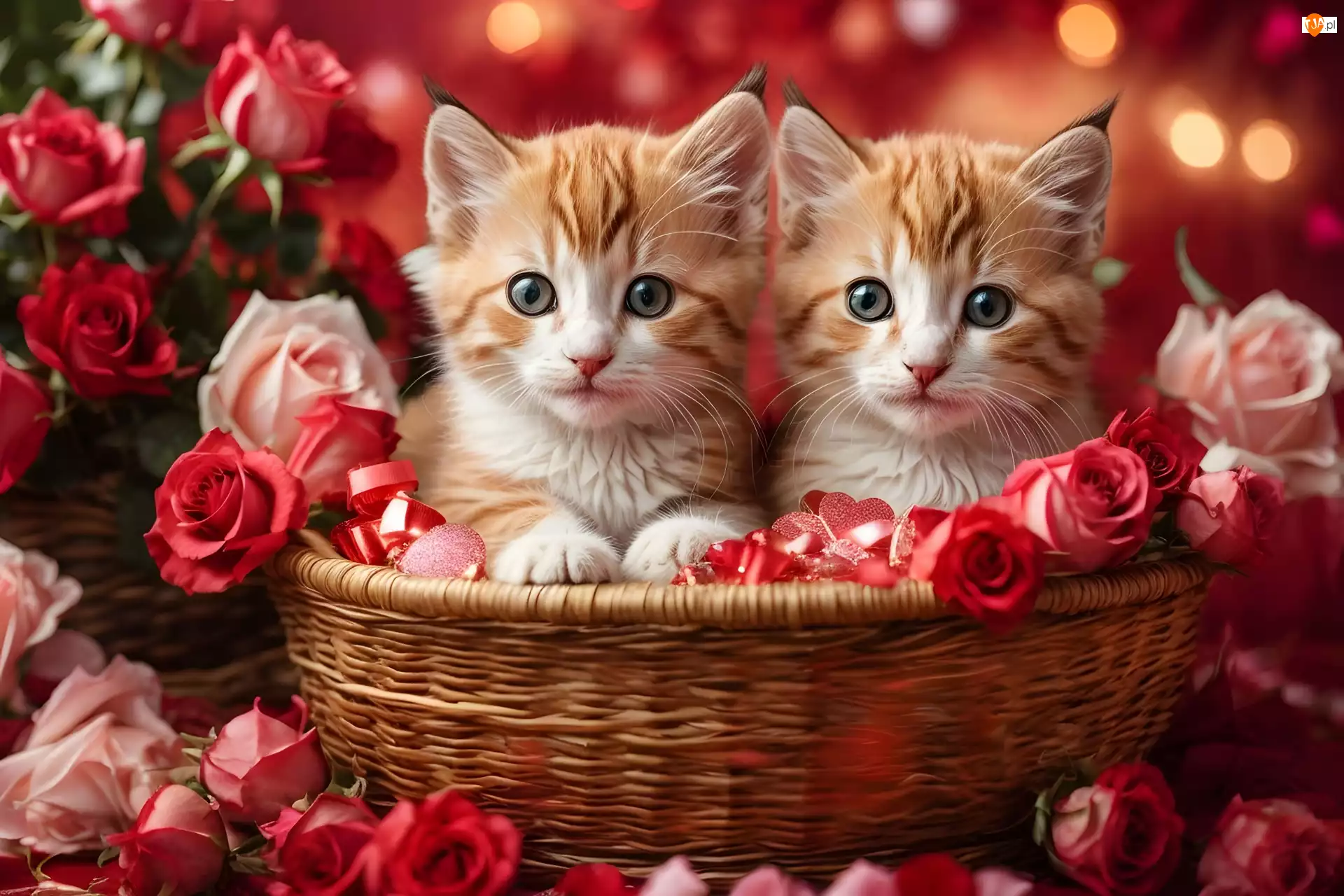 Kwiaty, Grafika, Koszyk, Koty, Róże