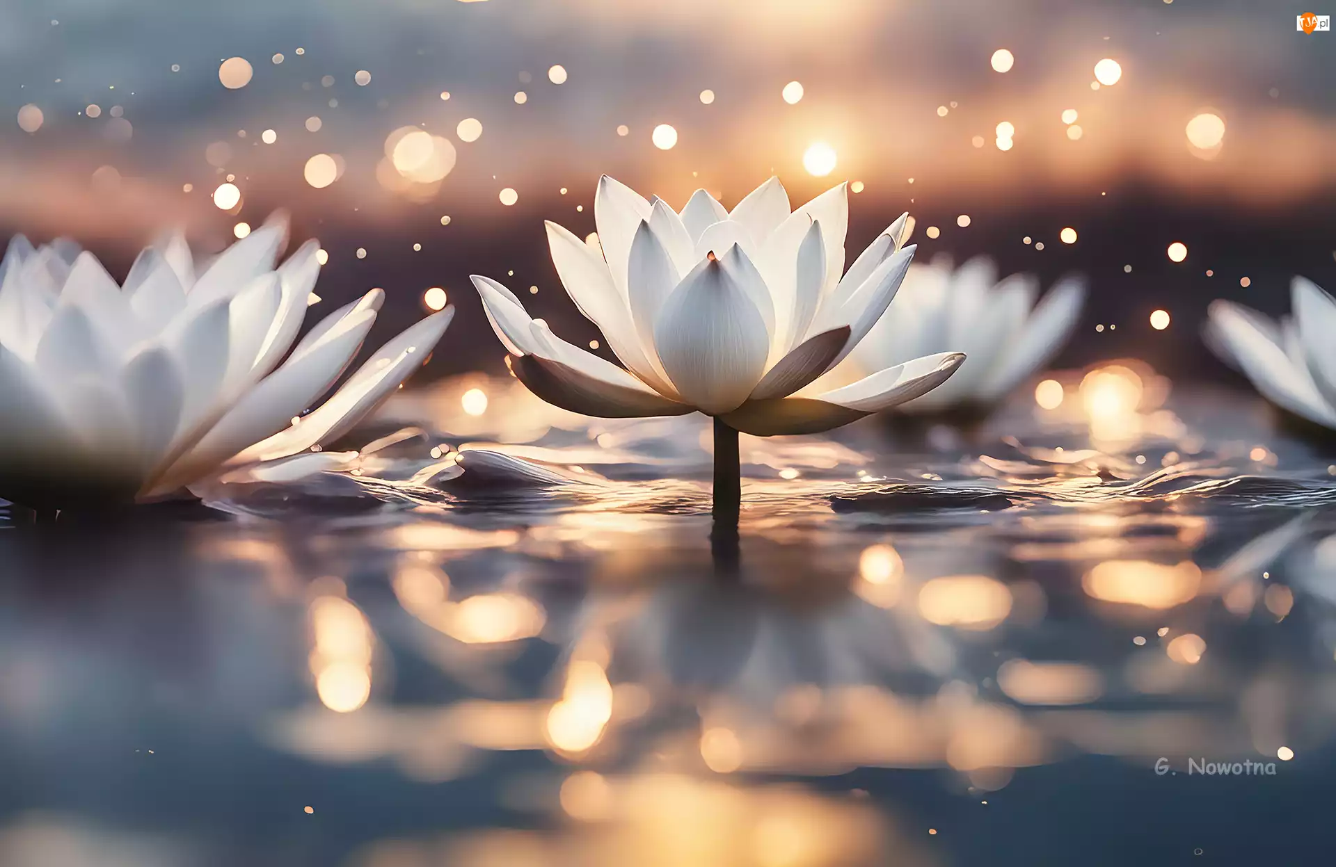 Kwiaty, Grafika, Lilie wodne, Białe, Woda