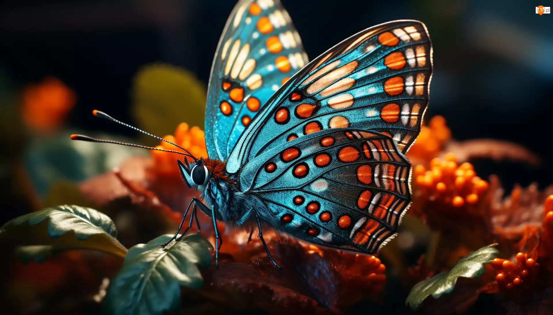 Kwiaty, Grafika, Niebieski, Motyl, Liście