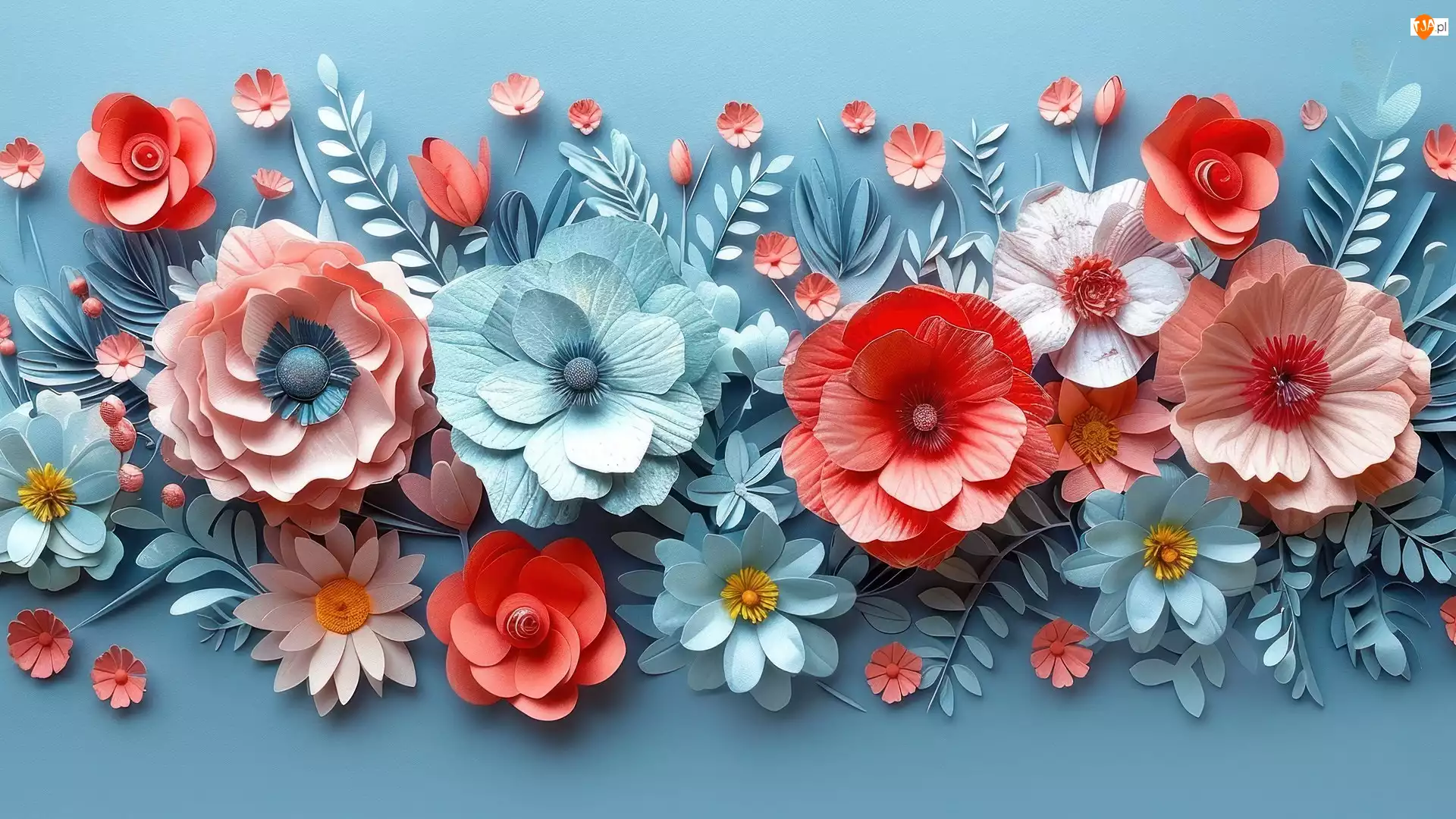 Kwiaty, Grafika, Niebieskie, Czerwone