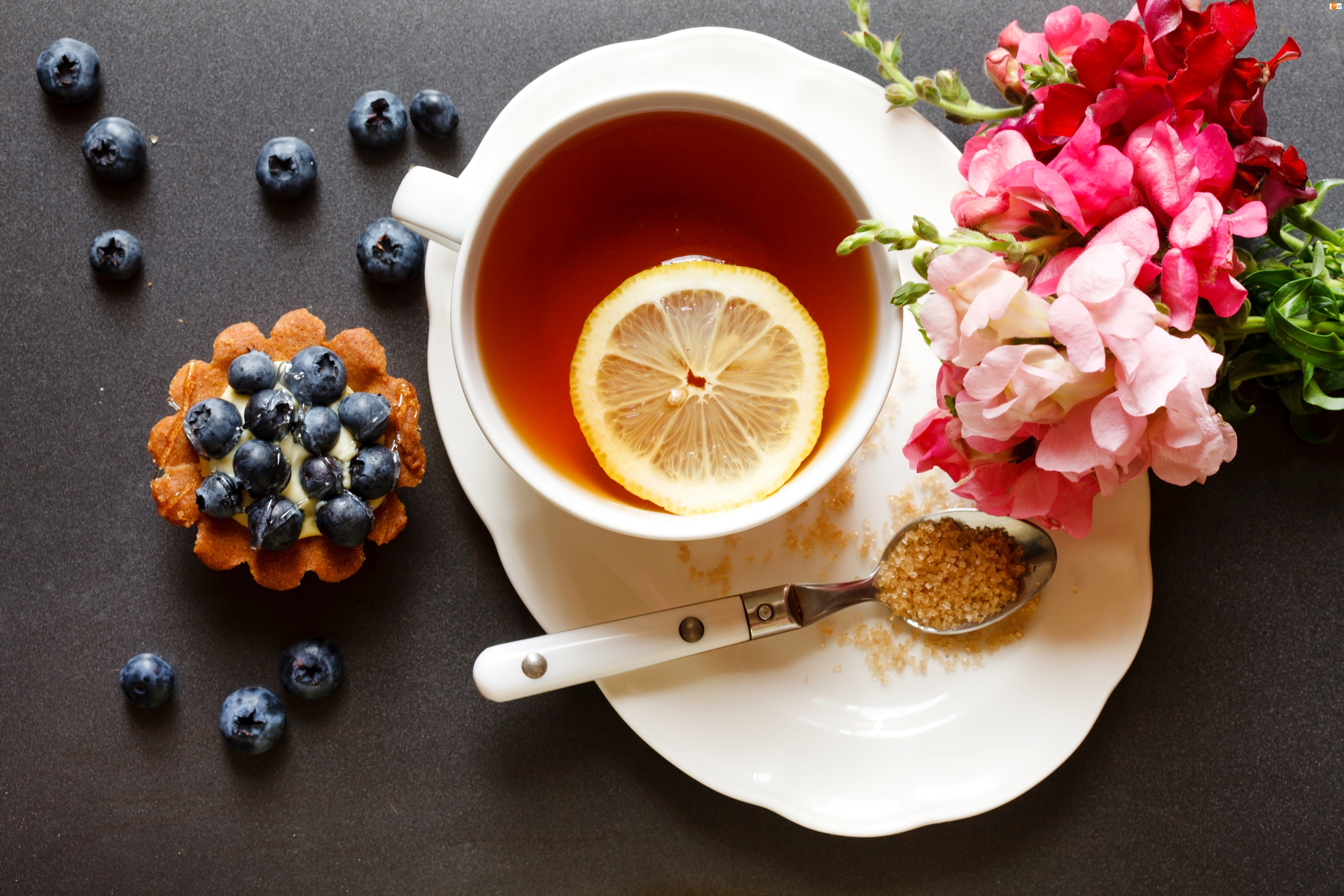 Kwiaty, Herbata, Babeczka, Cytryna, Jagody