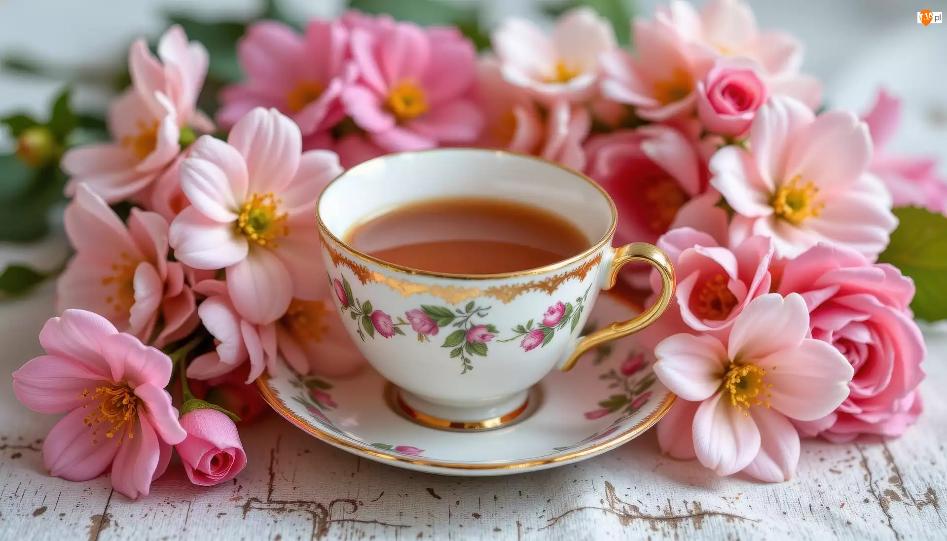 Kwiaty, Herbata, Filiżanka, Talerzyk