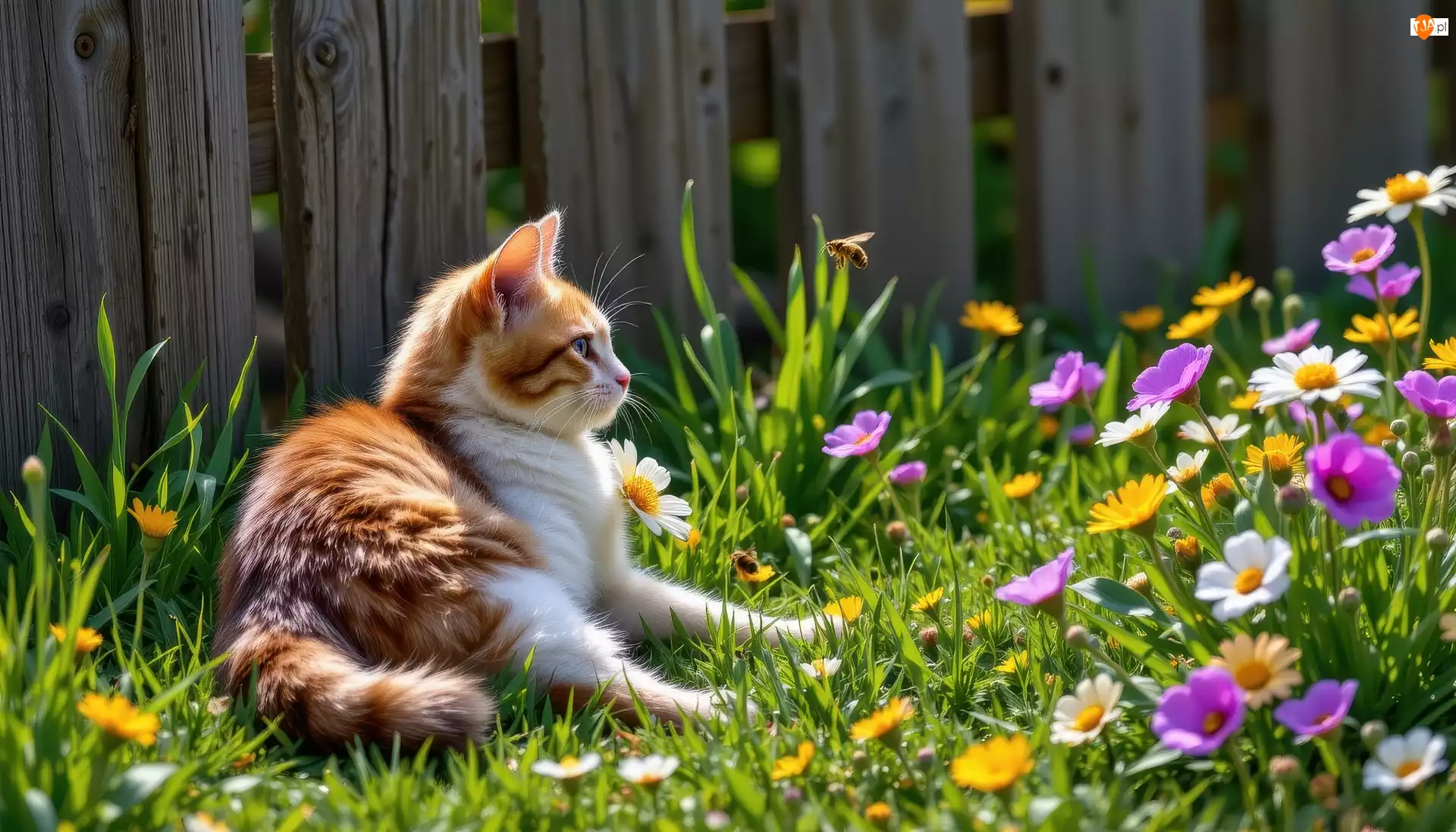 Pszczoła, Płot, Kot, Biało-rudy, Kwiaty