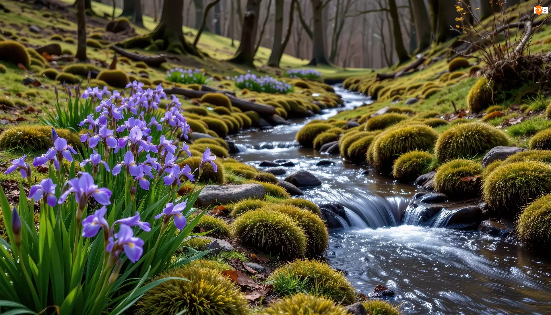 Kwiaty, Irysy, Mech, Grafika, Strumień, Las