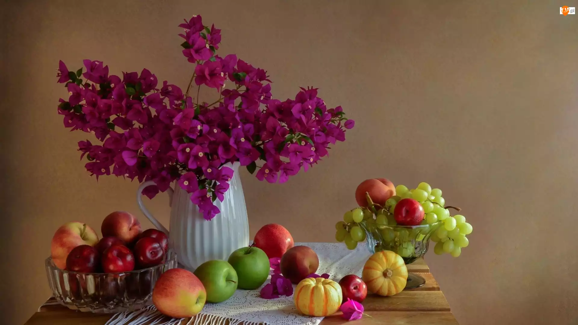 Kwiaty, Jabłka, Kompozycja, Winogrona, Dekoracja, Bugenwilla