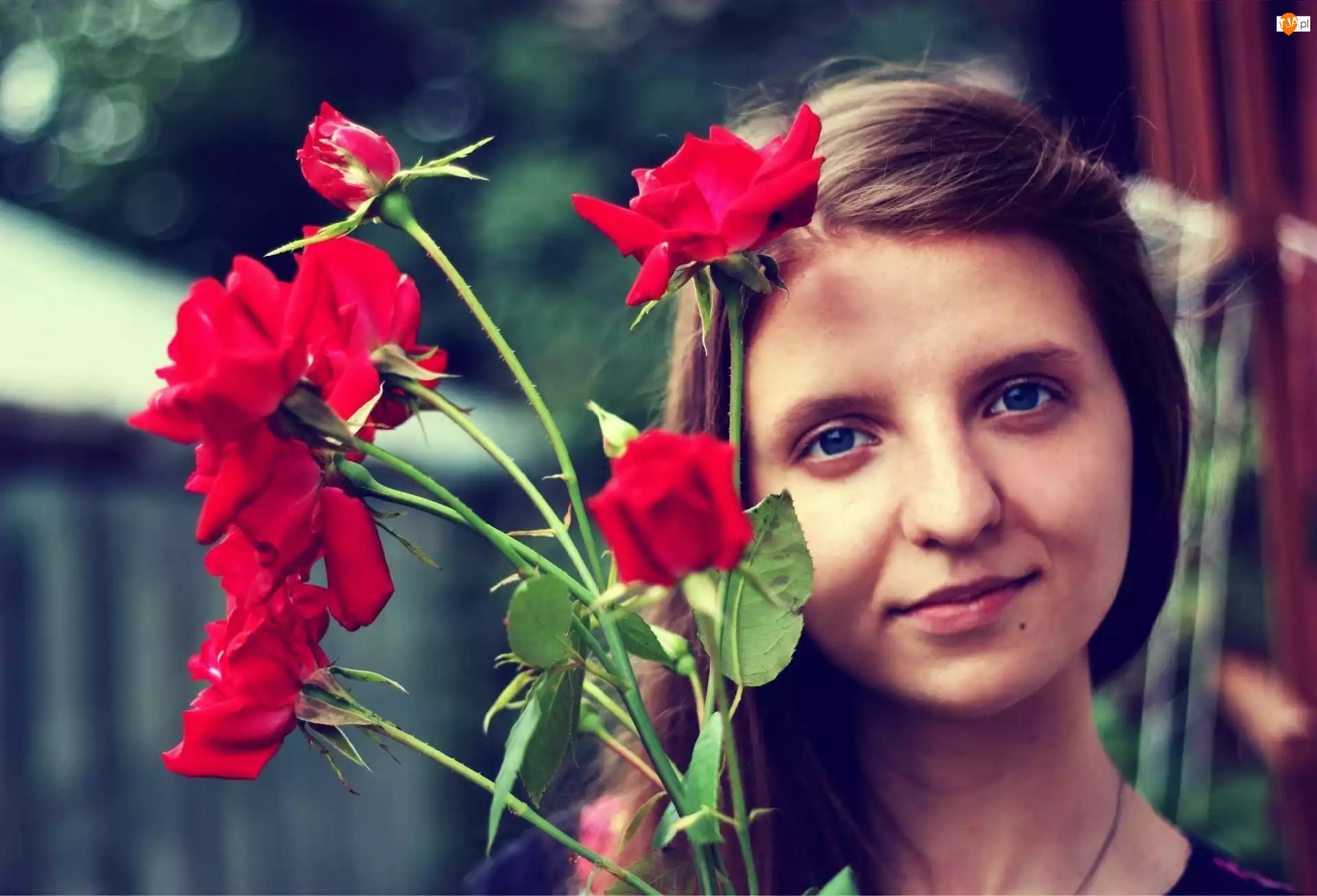 Kwiaty, Kobieta, Oczy, Niebieskie, Czerwone