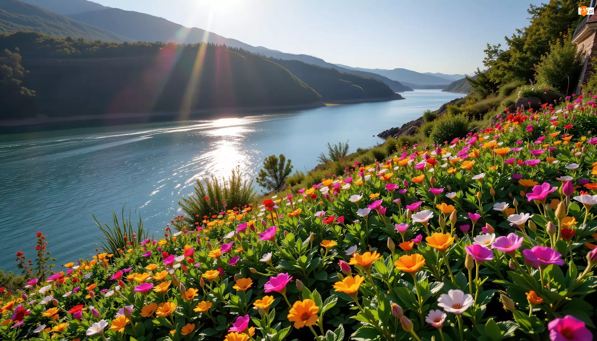 Kwiaty, Kolorowe, Rzeka, Grafika, Zbocze, Góry