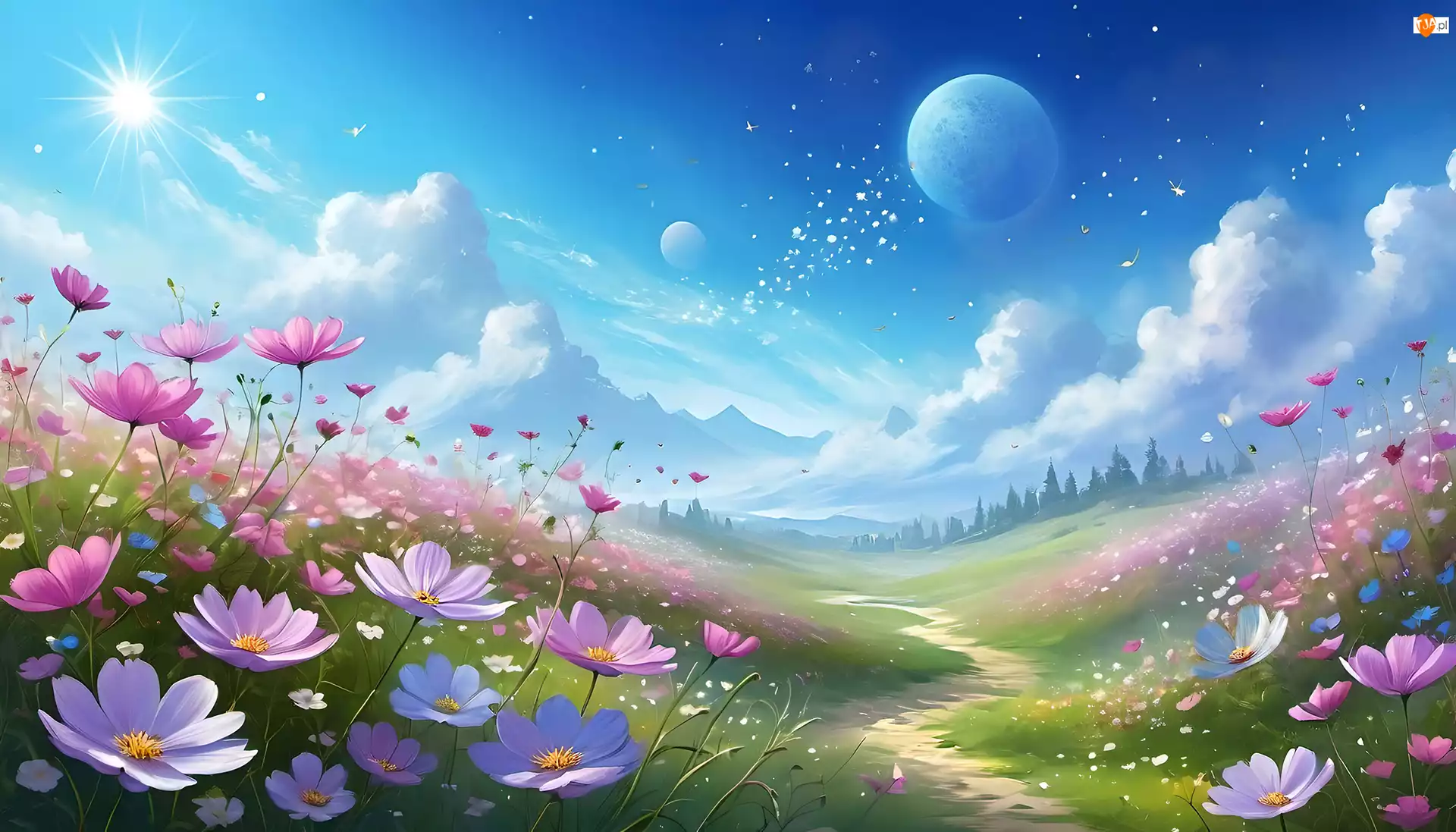 Kwiaty, Kosmea, Niebo, Grafika, Łąka, Planeta