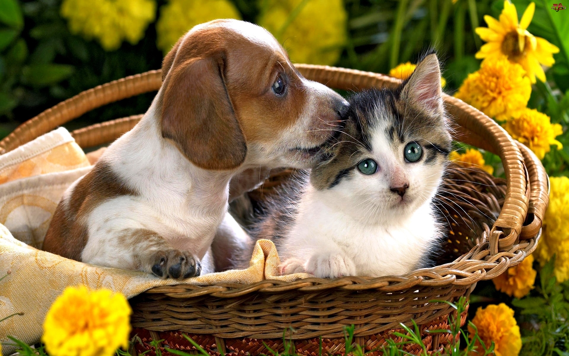 Kwiaty, Kot, Beagle, Szczeniaczek, Koszyk