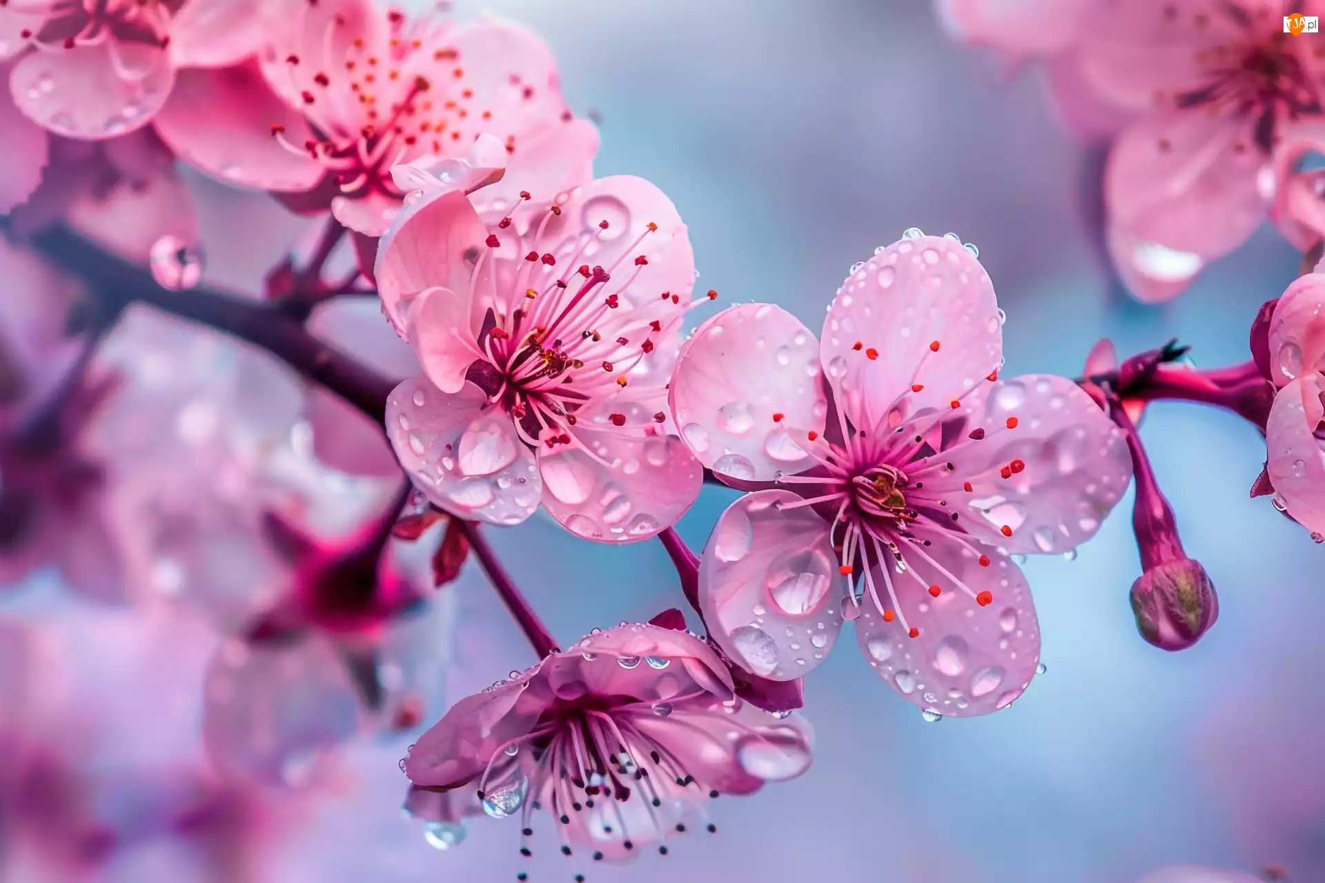 Kwiaty, Krople, Zbliżenie, Różowe, Drzewo owocowe, Gałęzie, Wody