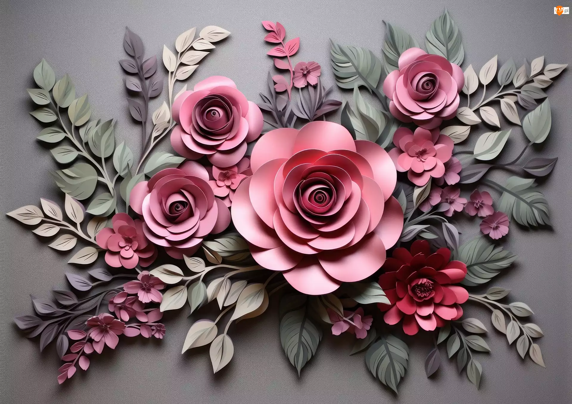 Kwiaty, Liście, Różowe, Grafika, Róże