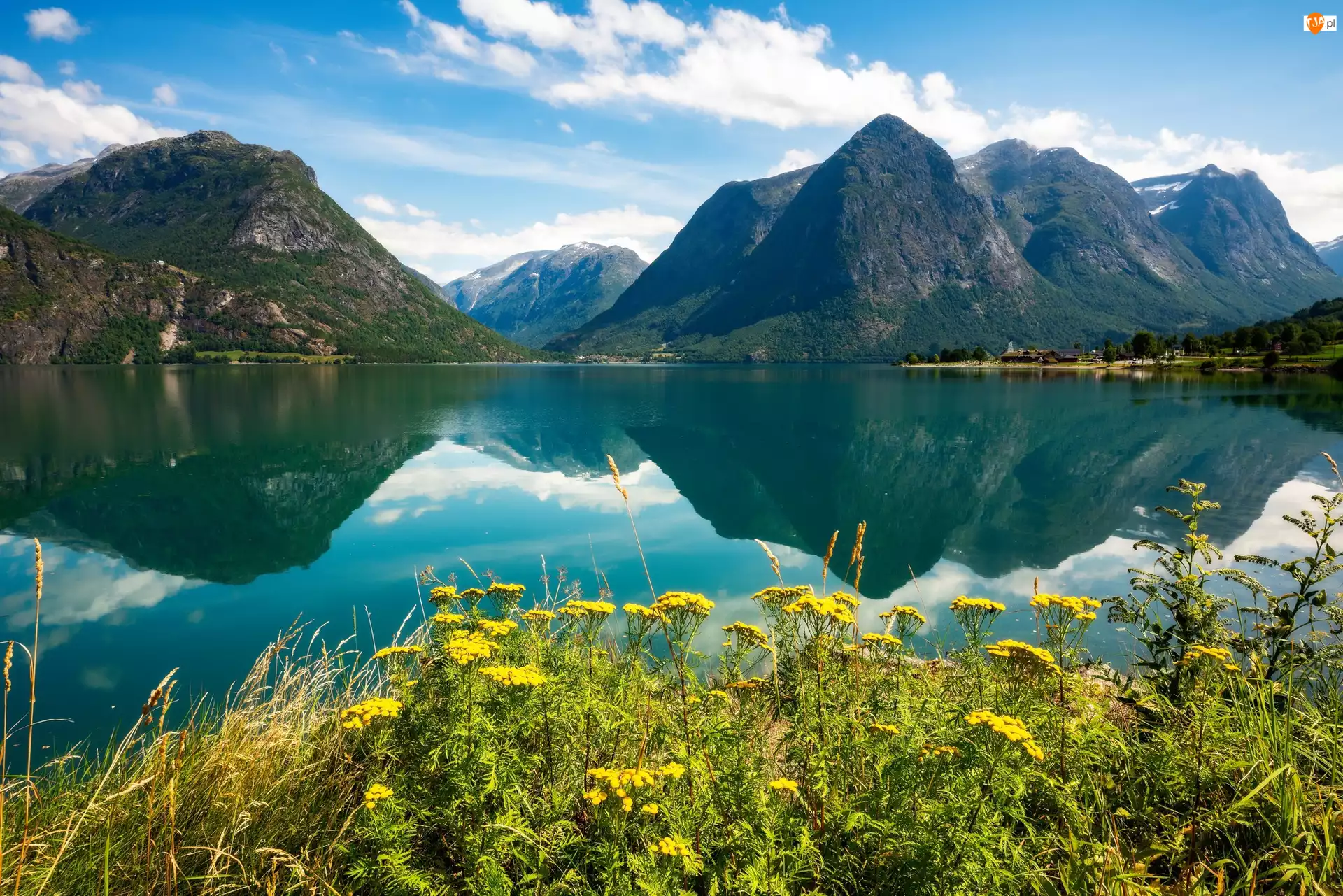 Jezioro, Góry, Wrotycz pospolity, Odbicie, Kwiaty, Chmury