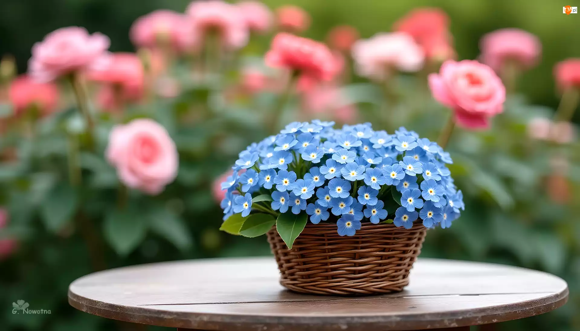 Kwiaty, Niebieskie, Okrągły, Grafika, Koszyk, Stolik