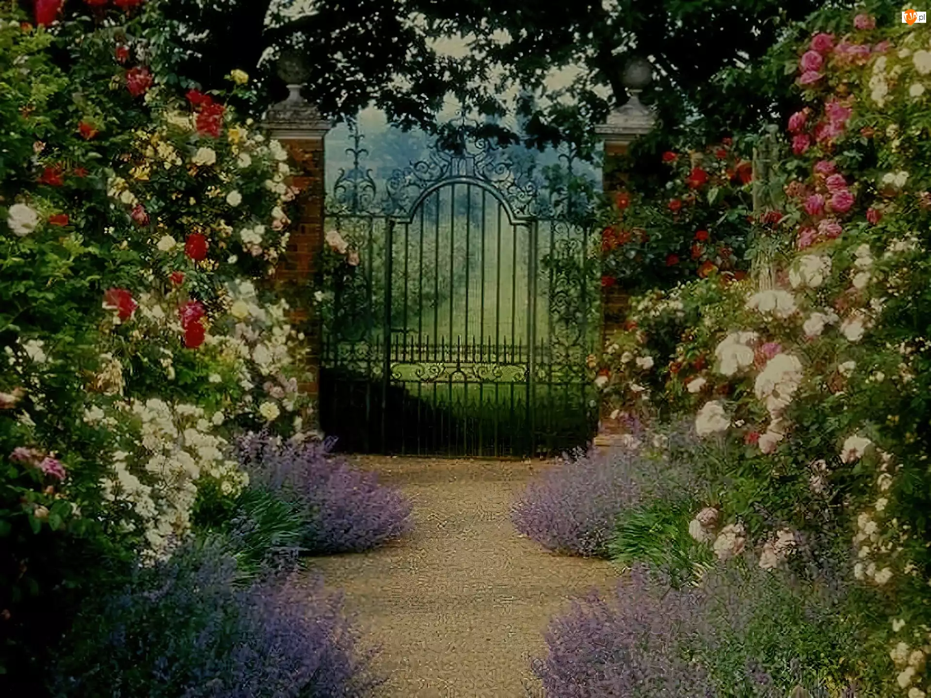 Kwiaty, Obraz, Park, Reprodukcja, Brama