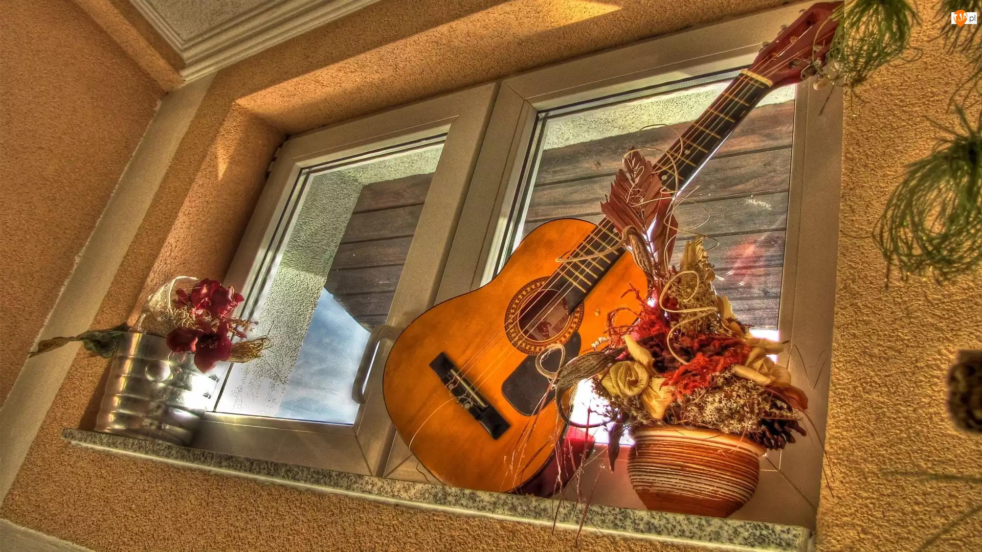 Kwiaty, Okno, Dekoracja, Gitara, Suszone