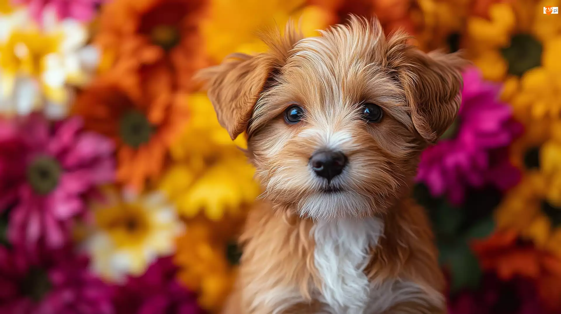 Kwiaty, Pies, Rudo-biały, Szczeniak