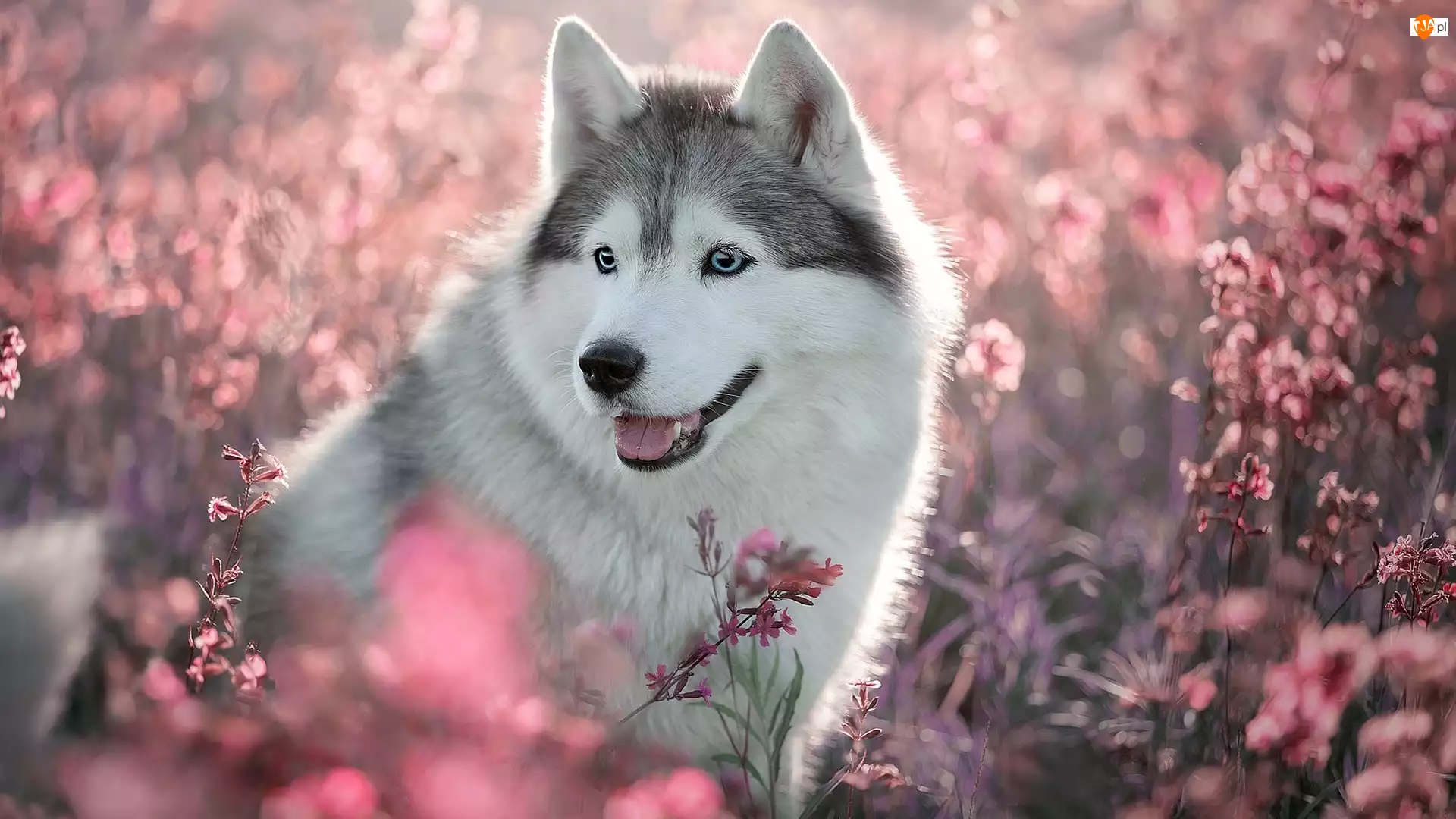 Kwiaty, Pies, Siberian husky, Różowe