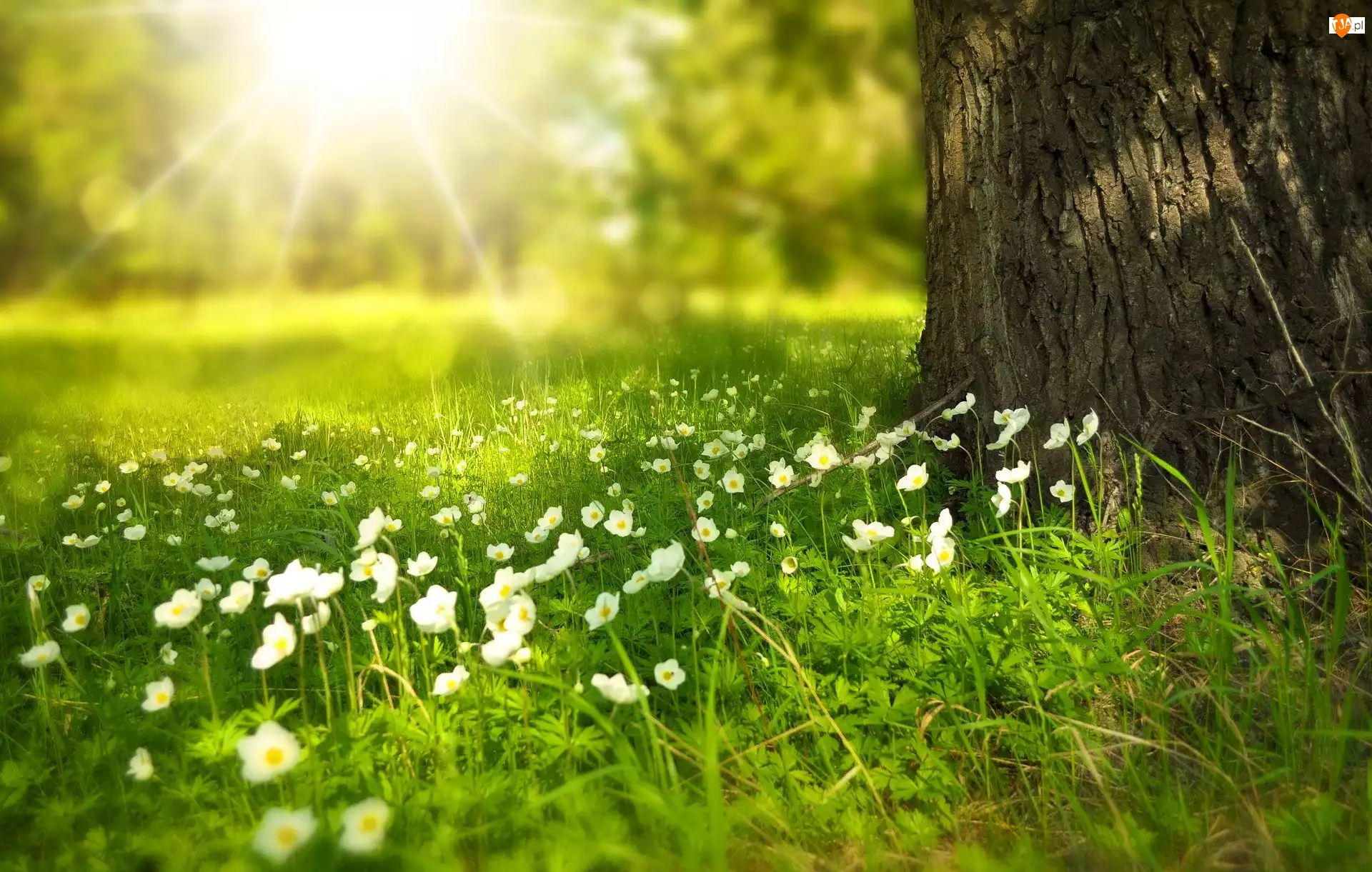 Drzewo, Wiosna, Białe, Słońce, Łąka, Kwiaty