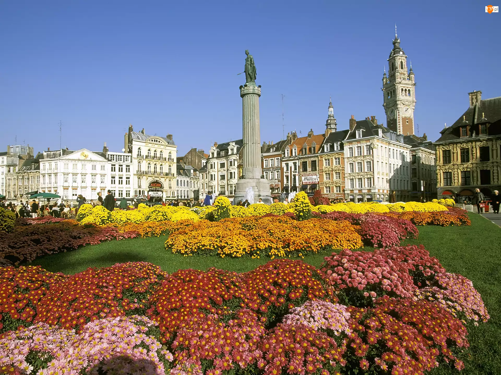 Kwiaty, Posąg, Starówka, Ludzie