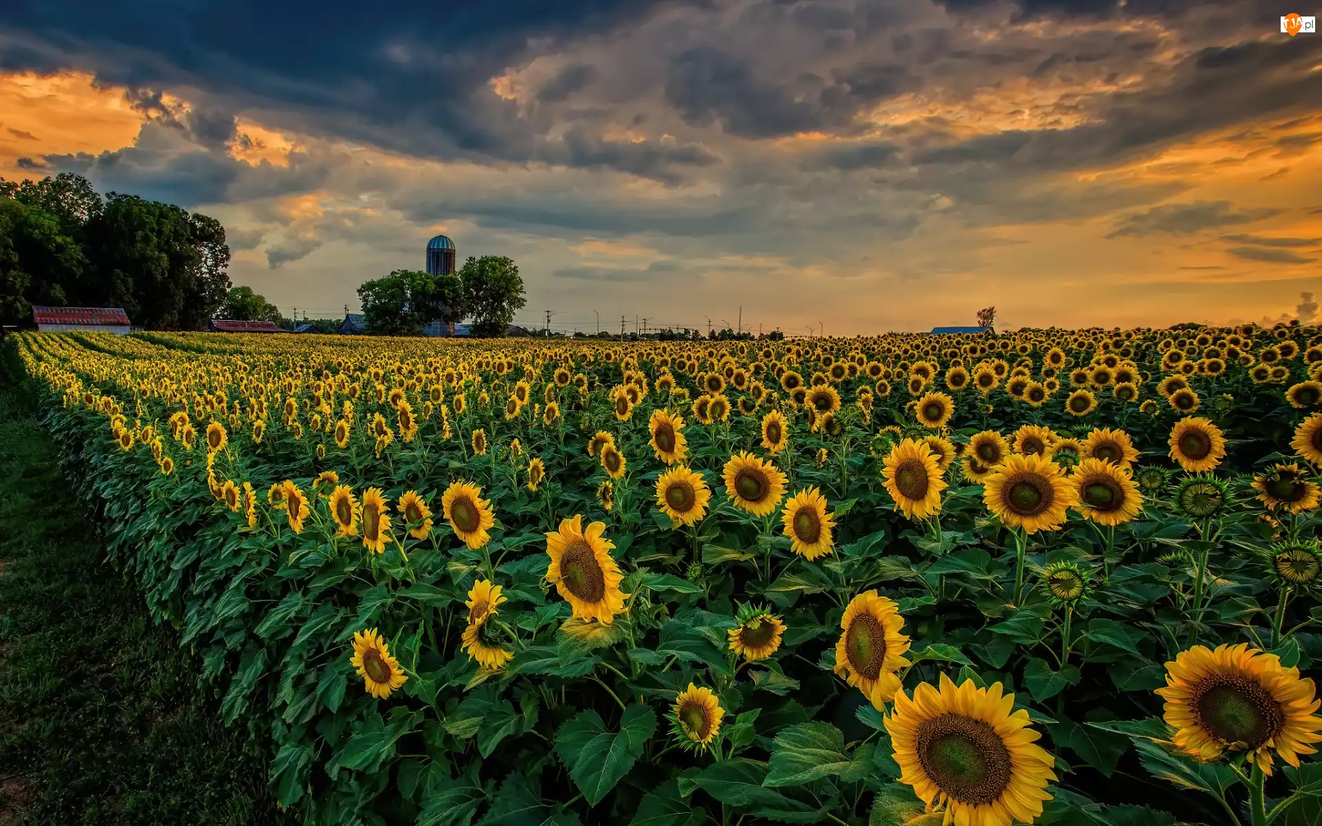 Kwiaty, Słoneczniki, Zachód słońca, Pole, Chmury, Drzewa, Lato