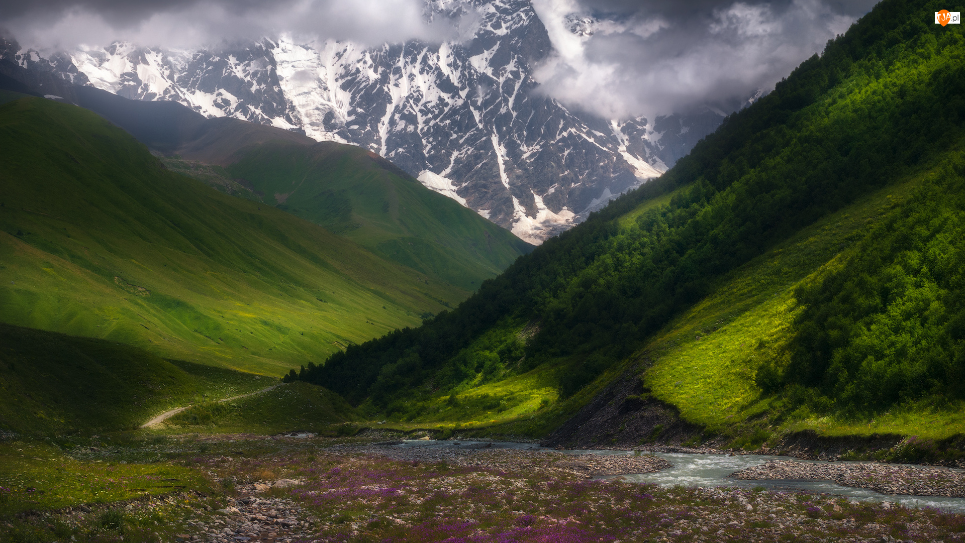 Gruzja, Dolina, Rzeka Inguri, Mgła, Zalesione, Góry, Kwiaty, Wzgórza, Trawa, Region Swanetia