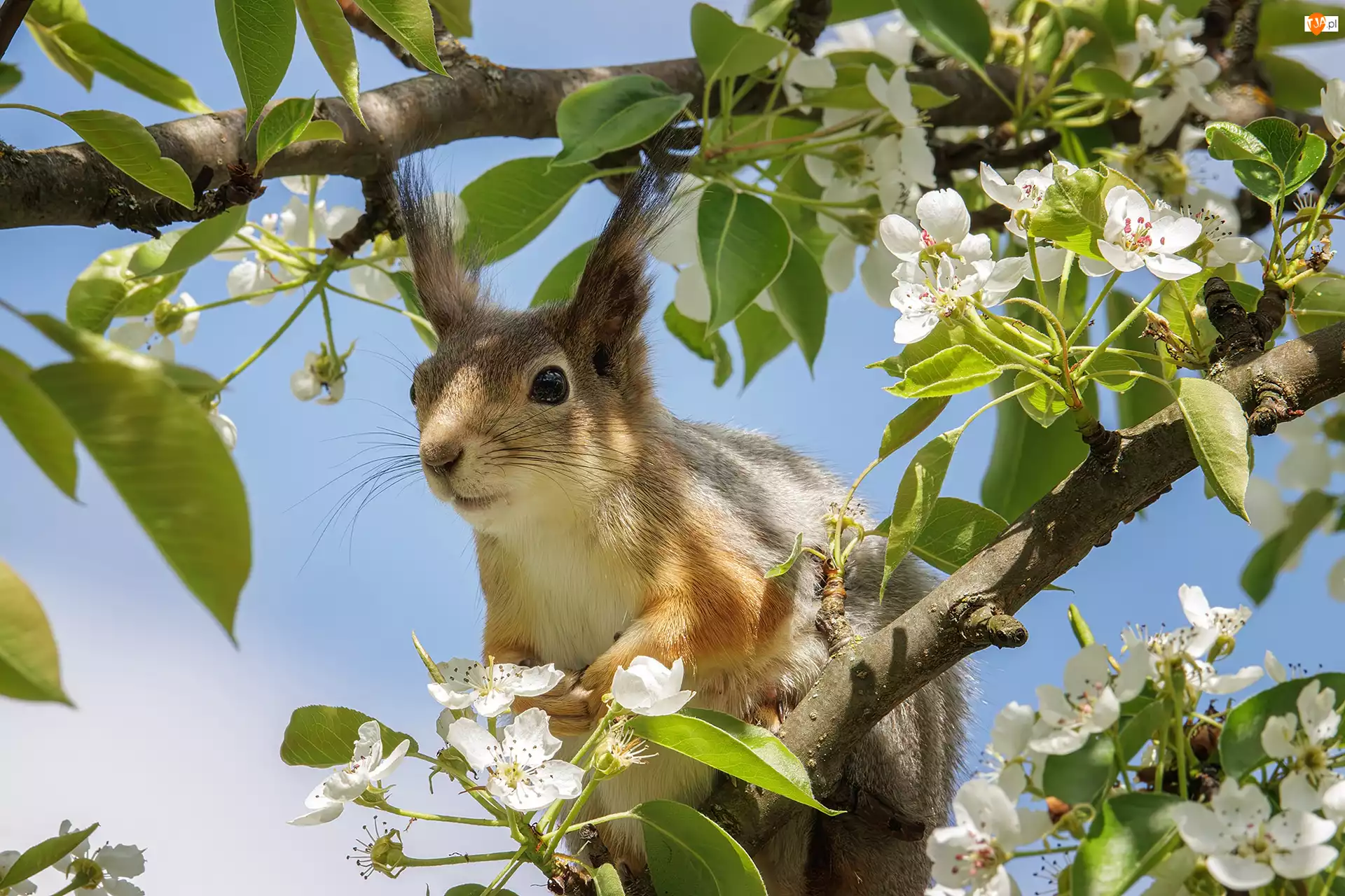 Kwiaty, Wiewiórka, Drzewo owocowe, Gałąź