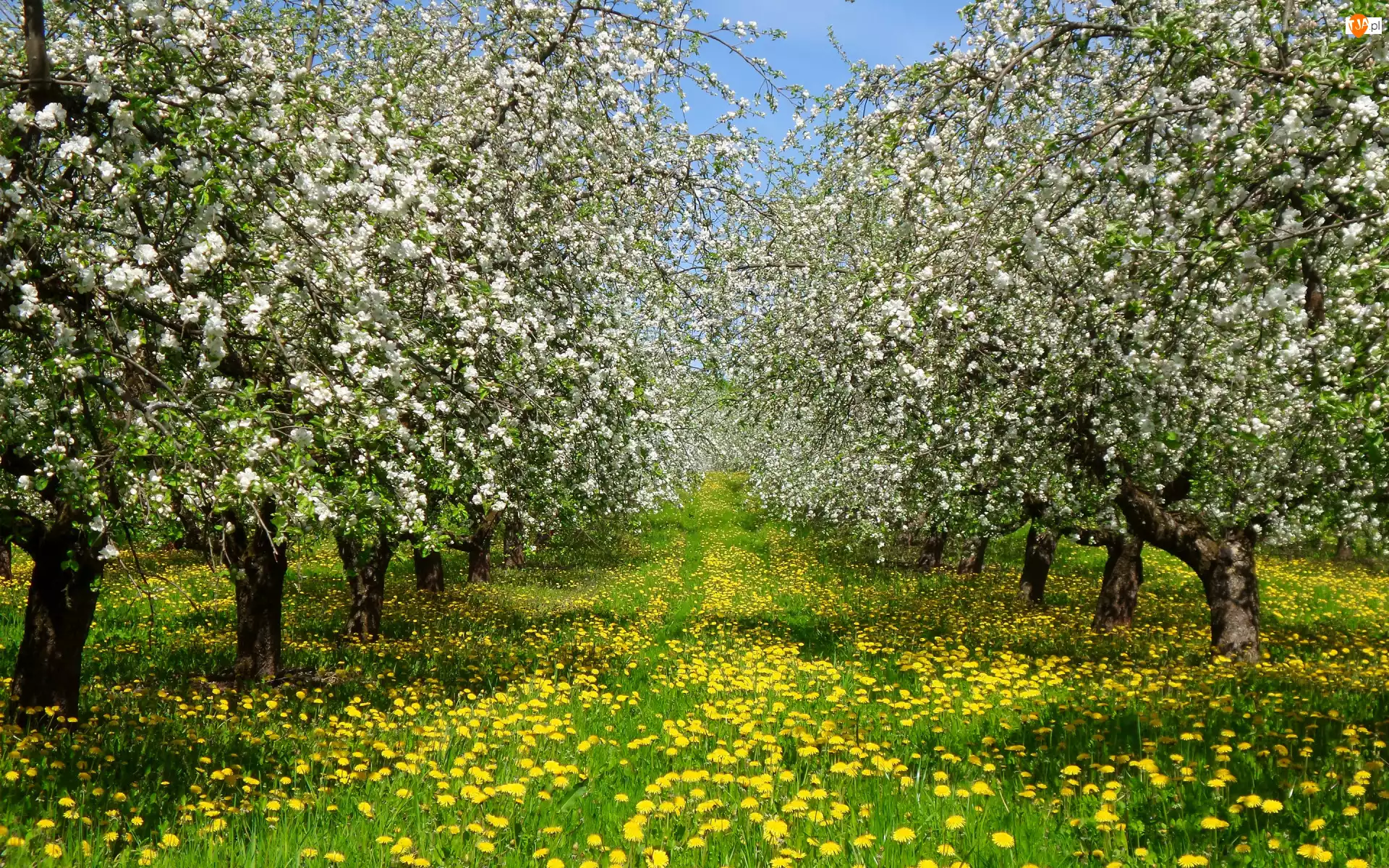 Kwitnące, Sad, Mniszek lekarski, Wiosna, Drzewa o