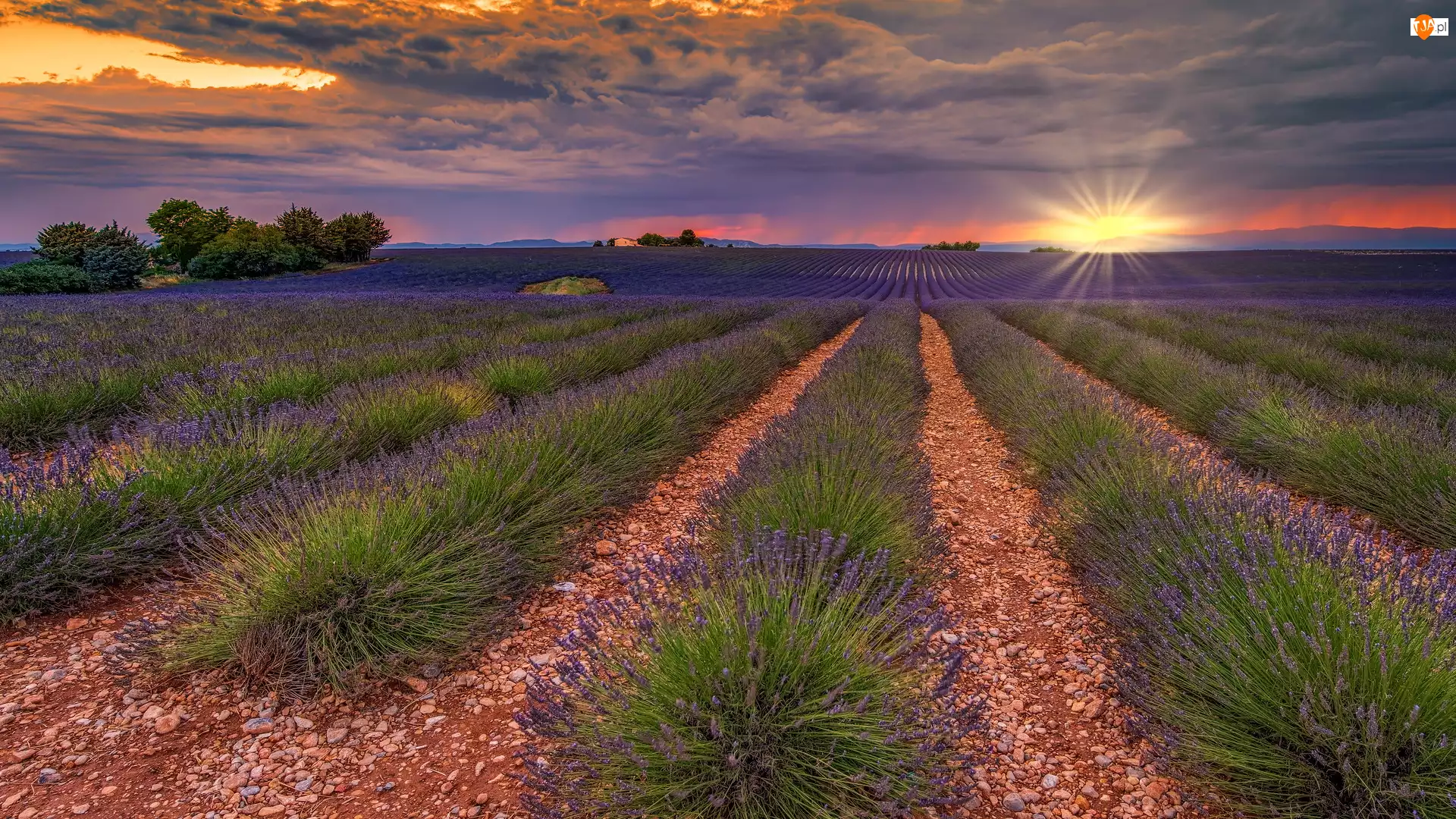 Valensole, Plantacja, Drzewa, Prowansja, Lawenda, Zachód słońca, Francja, Pole