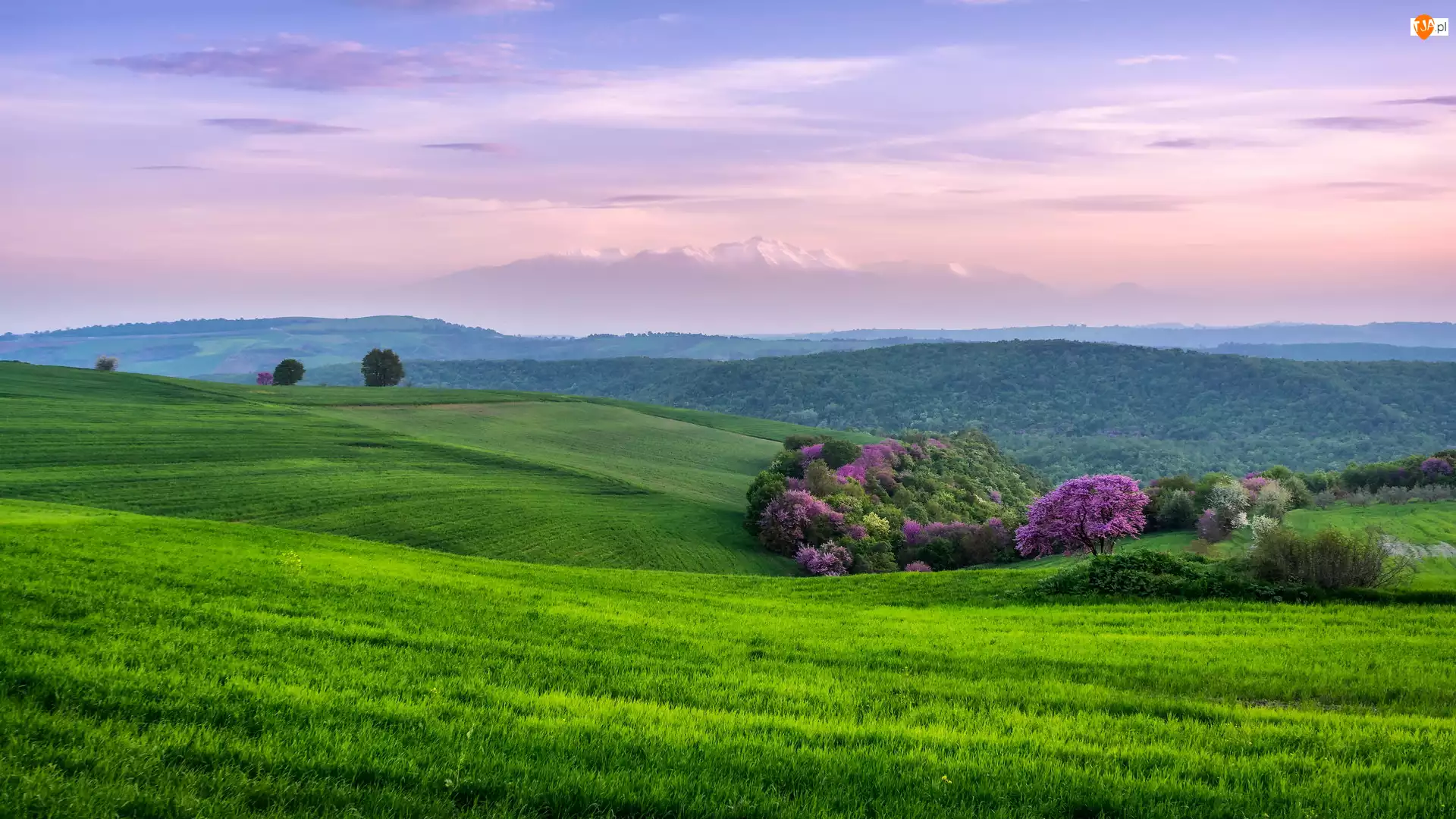 Kwitnące drzewa na zielonych wzgórzach na tle g�