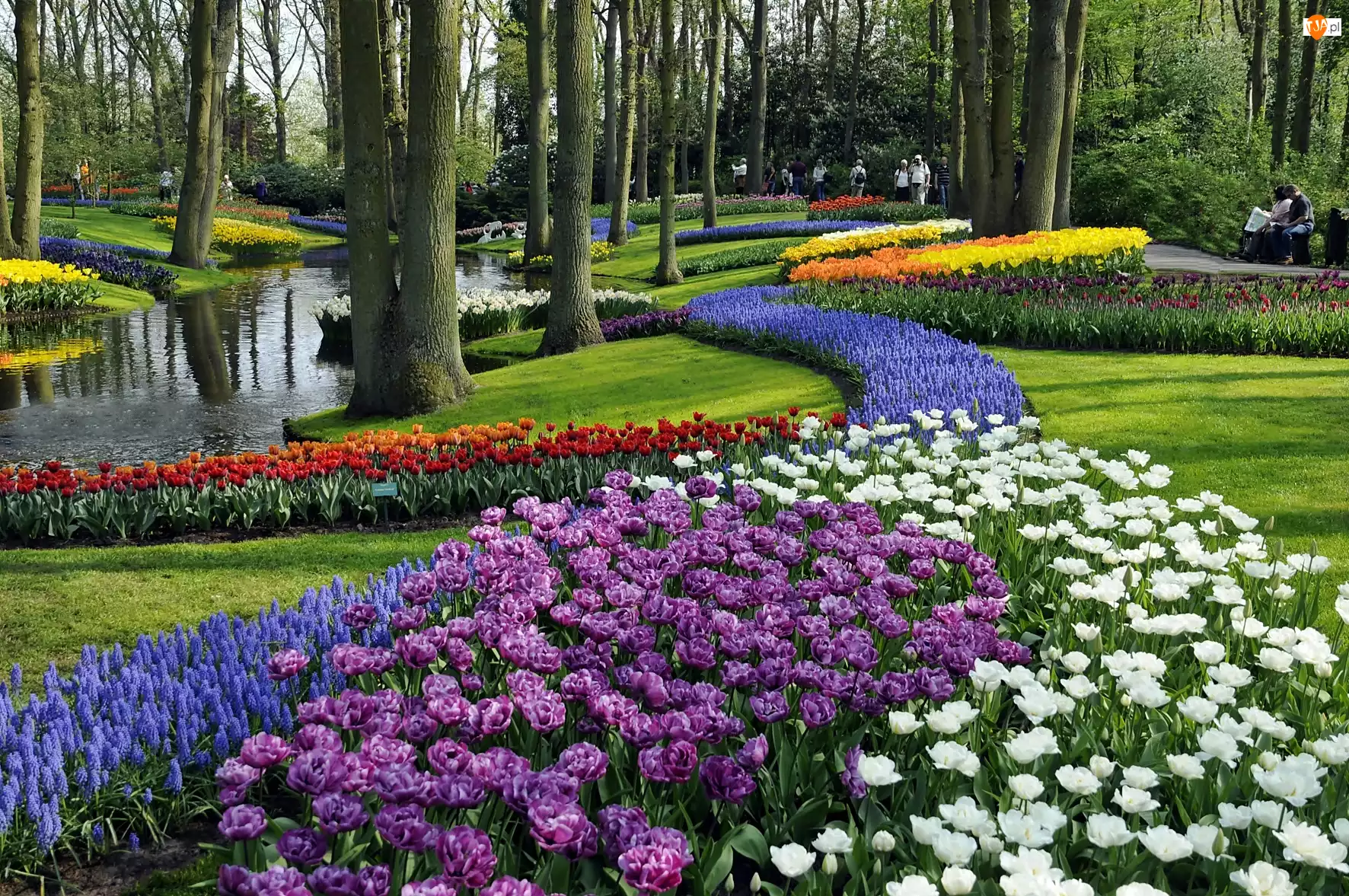 Kwitnące, Szafirki, Park, Spacerowicze, Rzeczka, Tulipany